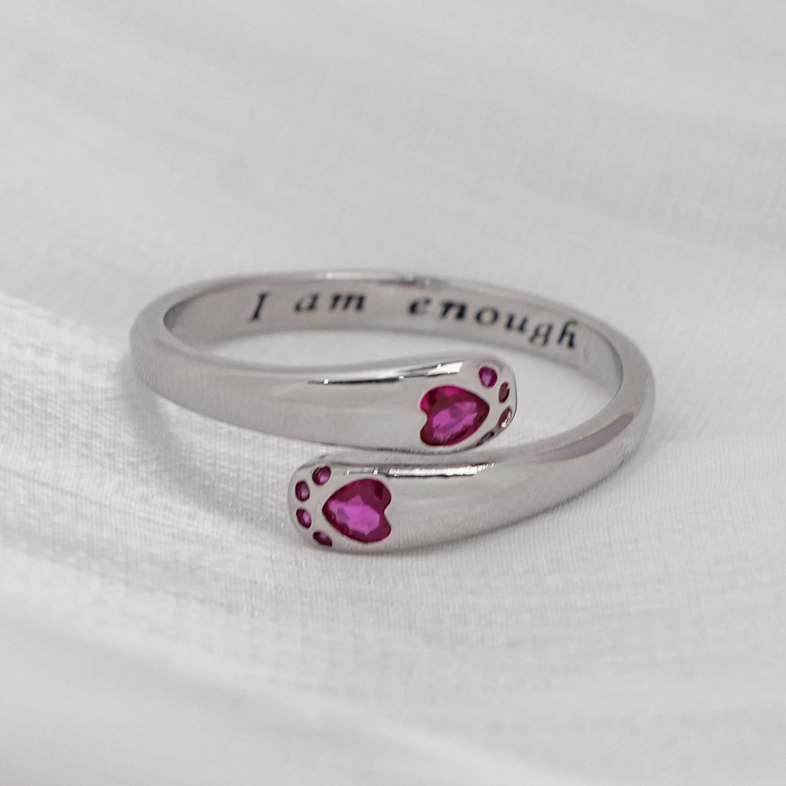 Unique Design - This charming ring features a delicate design with two cat paws embracing a heart-shaped birthstone. The inscription "I am enough" adds a meaningful touch, making it a perfect reminder of self-love and acceptance.