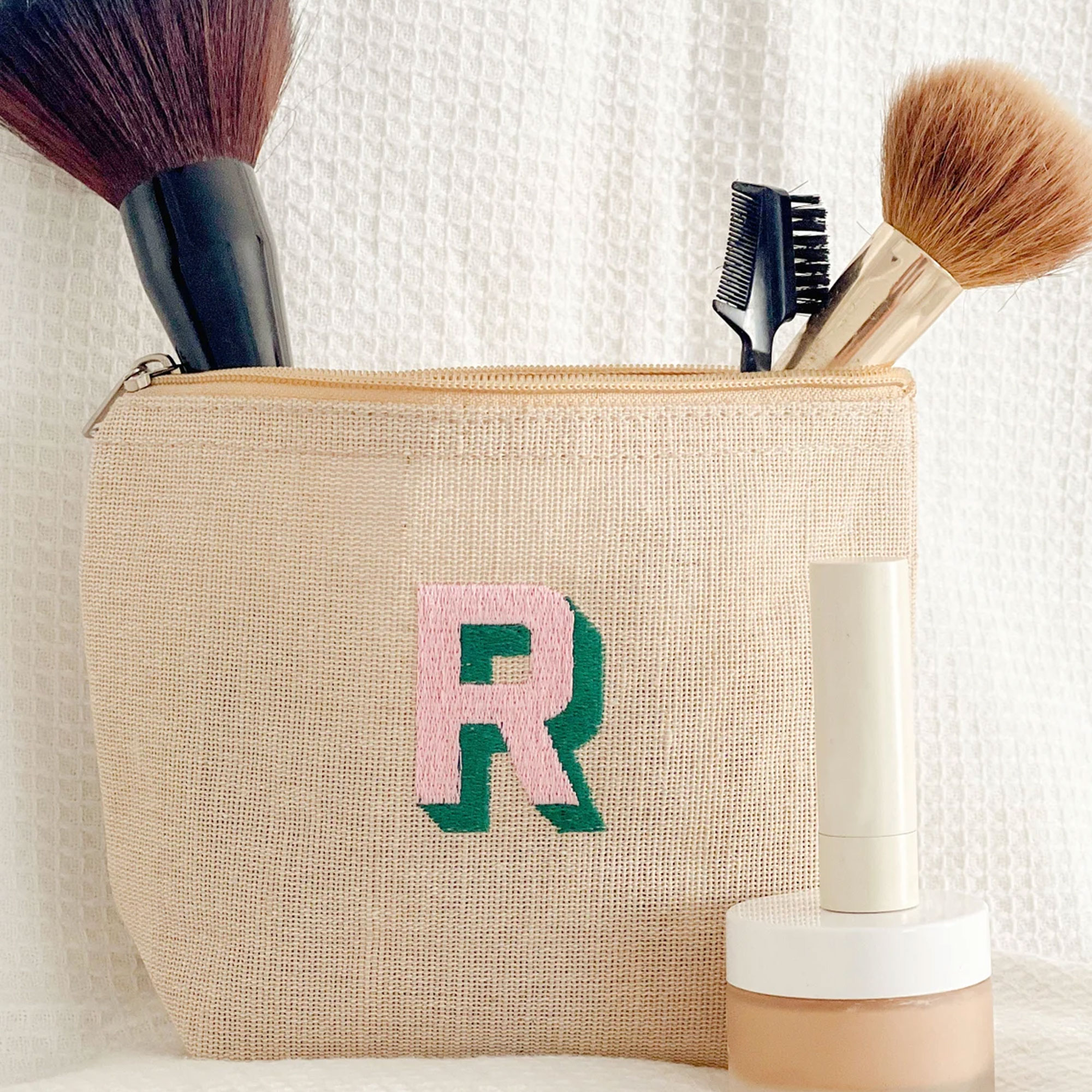 Charming Tennis-Inspired Design – This stylish jute cosmetic bag features a playful yet chic monogram design. Crafted with precision embroidery, feminine flair to the traditional monogram look. Available in multiple designs—it’s perfect for personalizing your favorite player or fan.