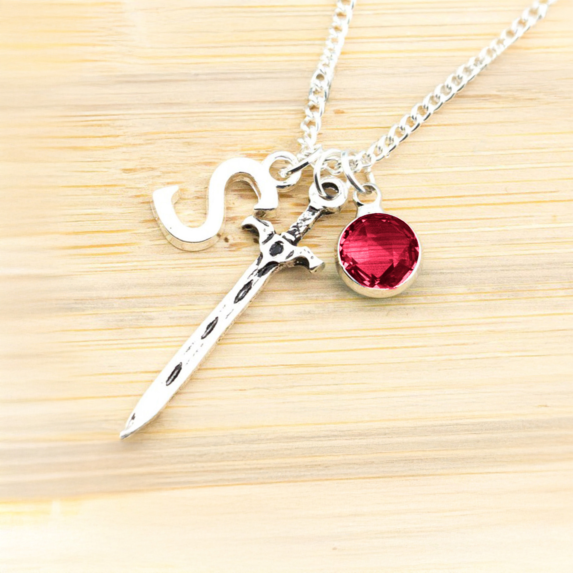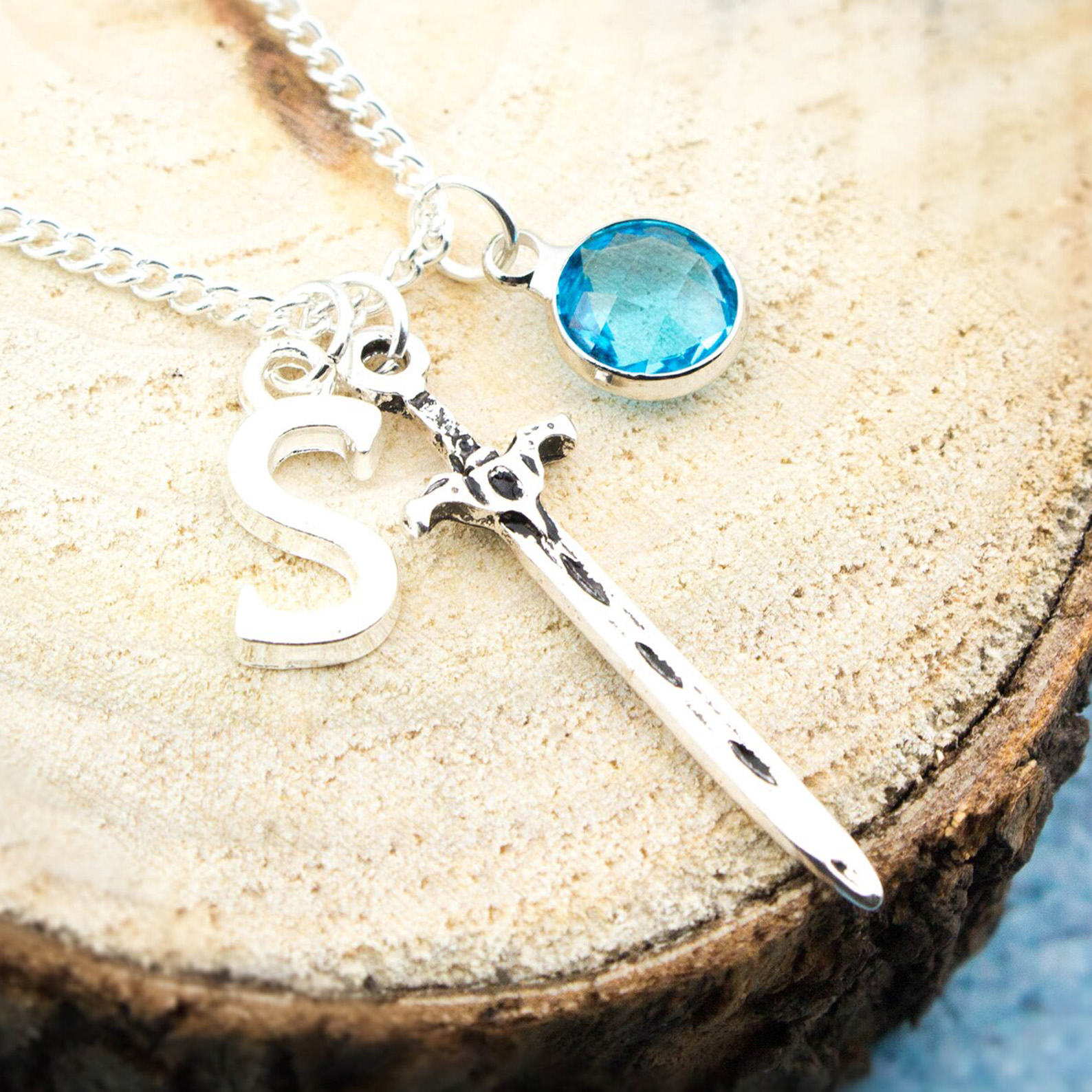 Fantasy-Inspired Sword Design – This enchanting necklace features a detailed sword-shaped pendant with a vintage-inspired blade and ornate hilt, evoking the magic of fantasy worlds. Paired with a sparkling birthstone and a personalized initial charm, it’s a bold yet elegant tribute to adventure and imagination.