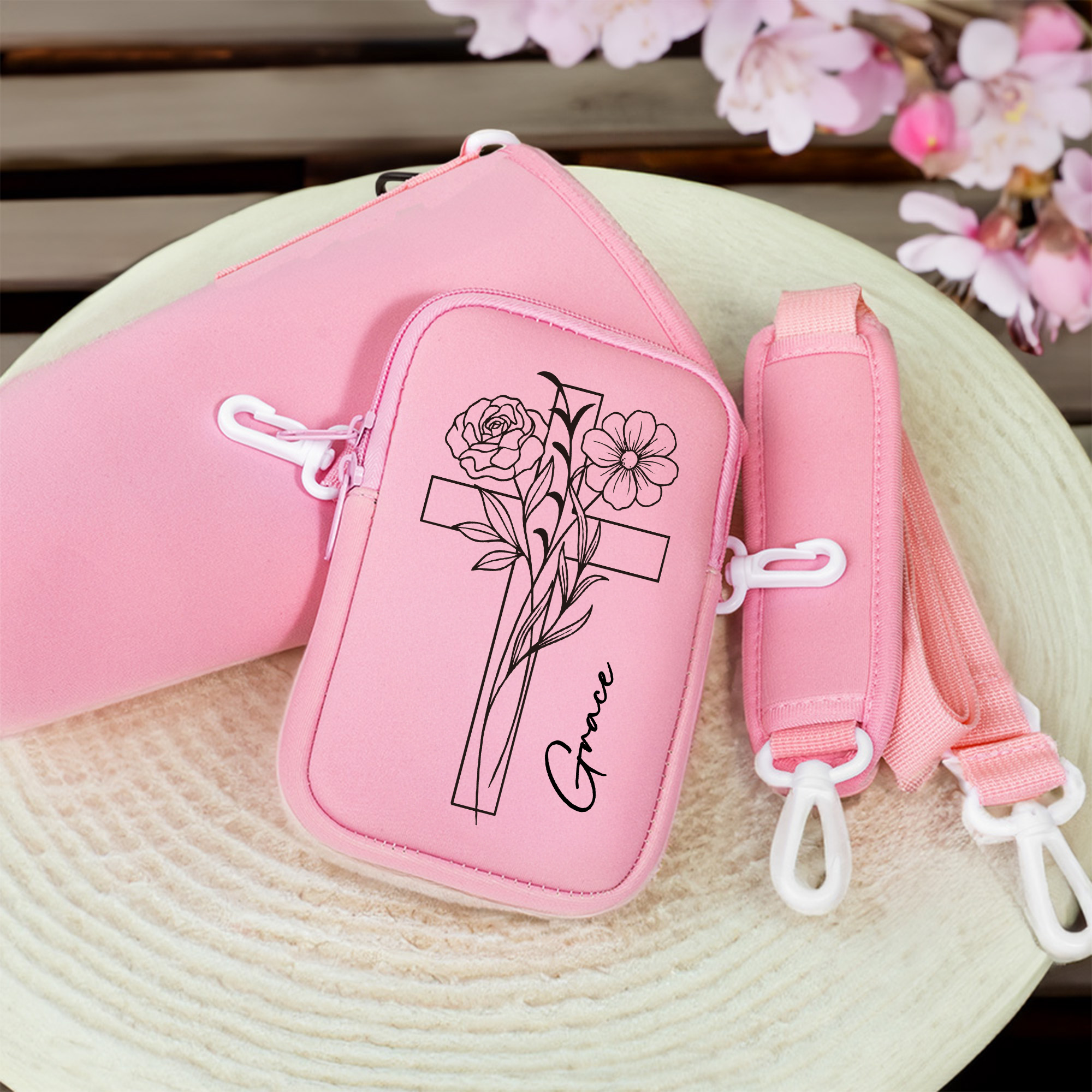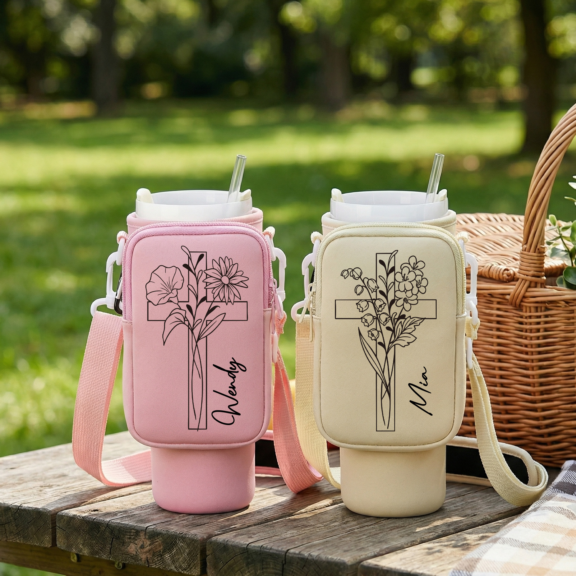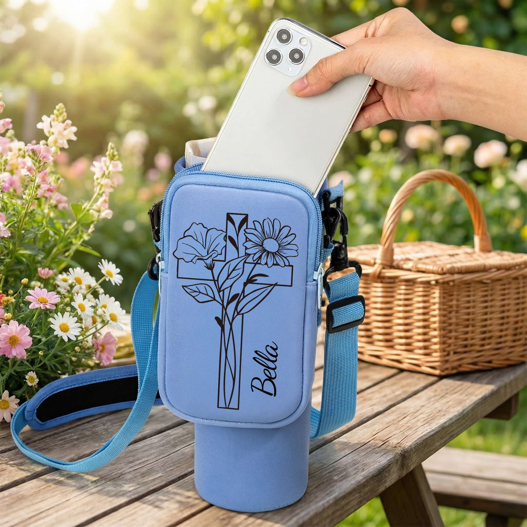 | Style | Custom Name Birth Flower Cross Water Bottle Carrier Bag with Pouch |