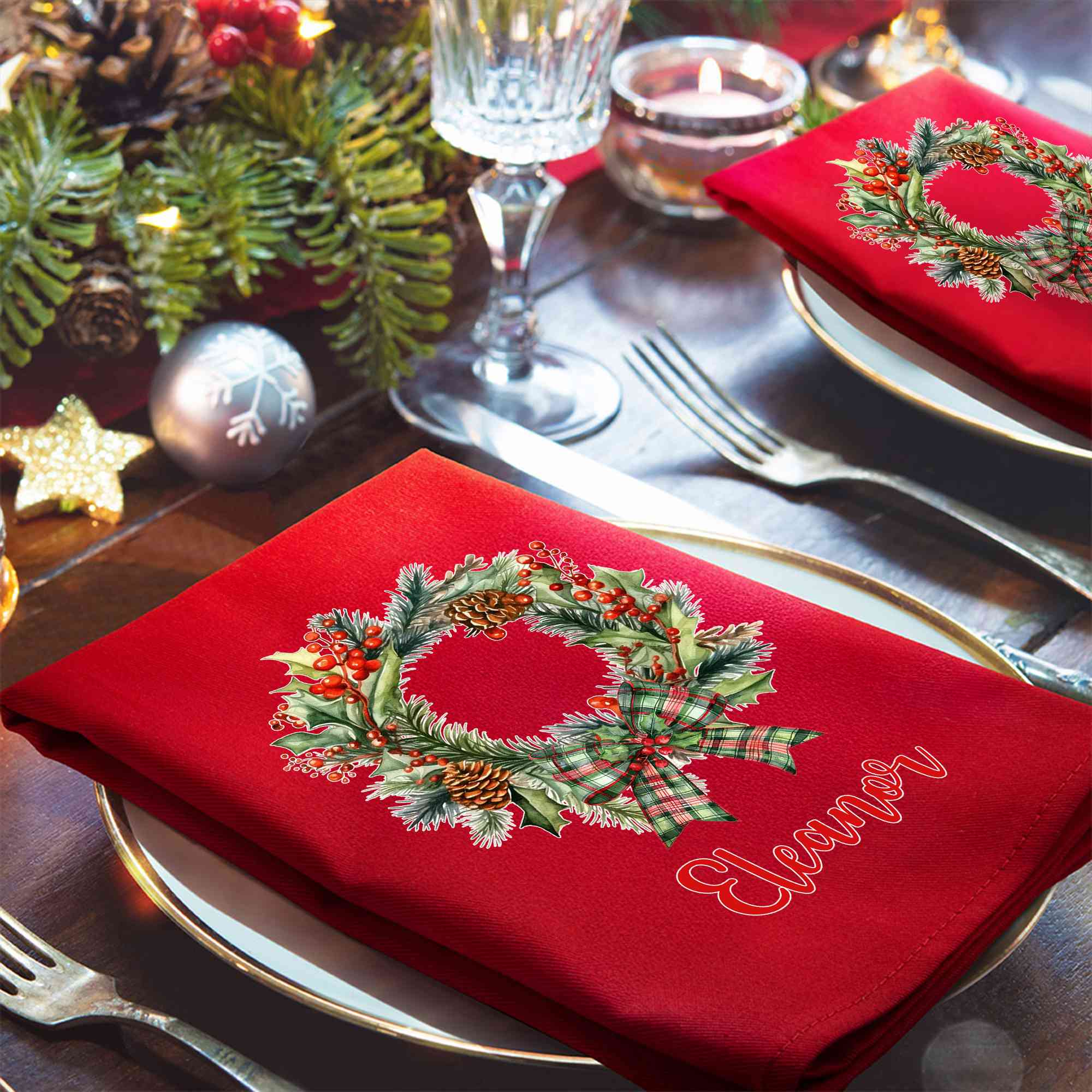 | Style | Custom Name Christmas Plaid Bow Wreath Napkin |