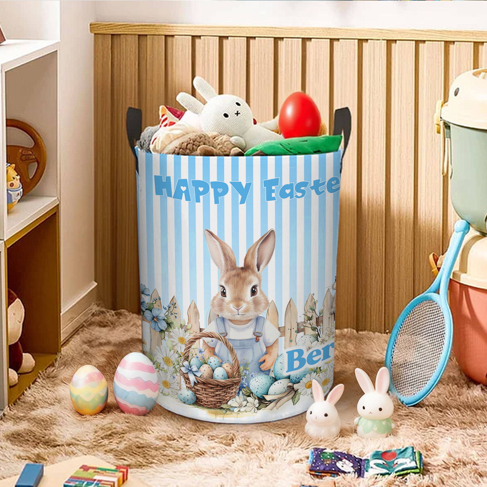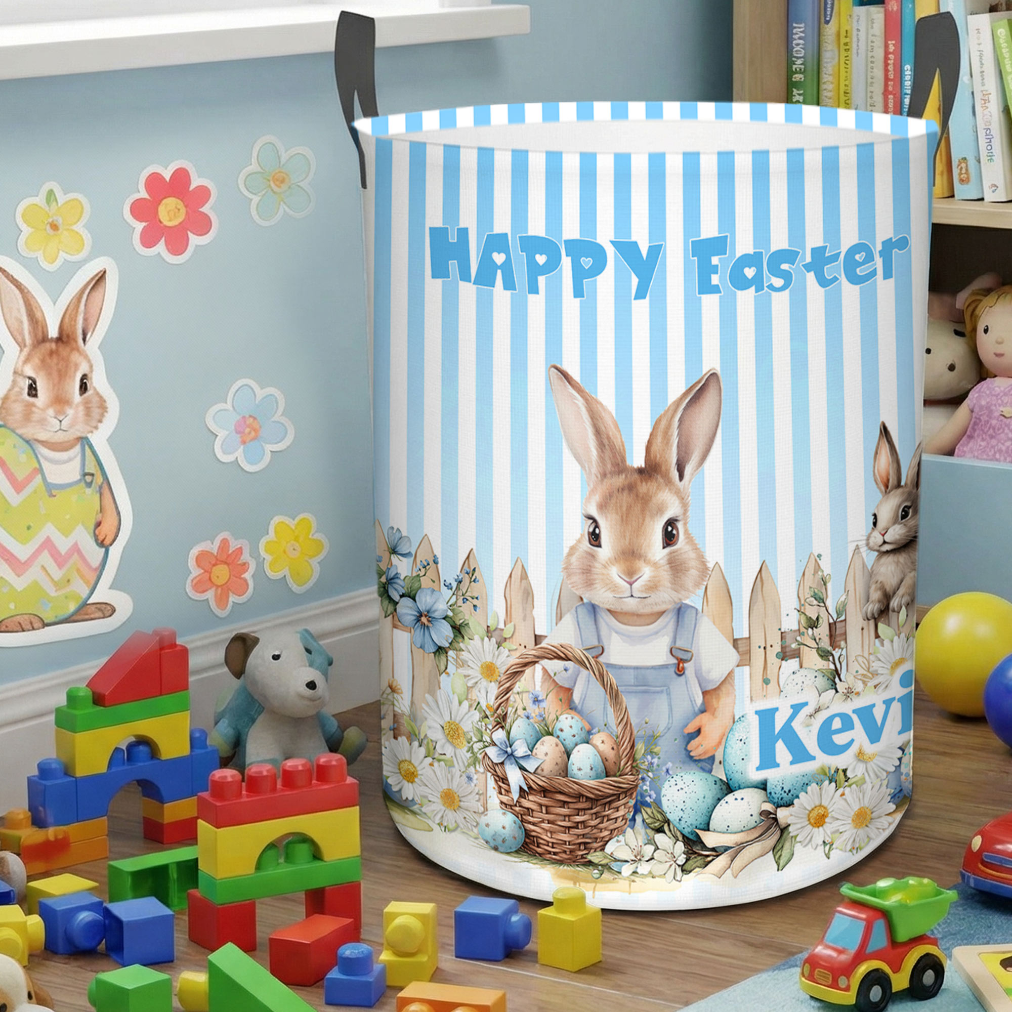 Easter Bunny Design - The Happy Easter basket features a charming floral rabbit and Easter eggs illustration that adds a soft, cheerful touch to any nursery or child’s room, with a cartoon style children instantly love.