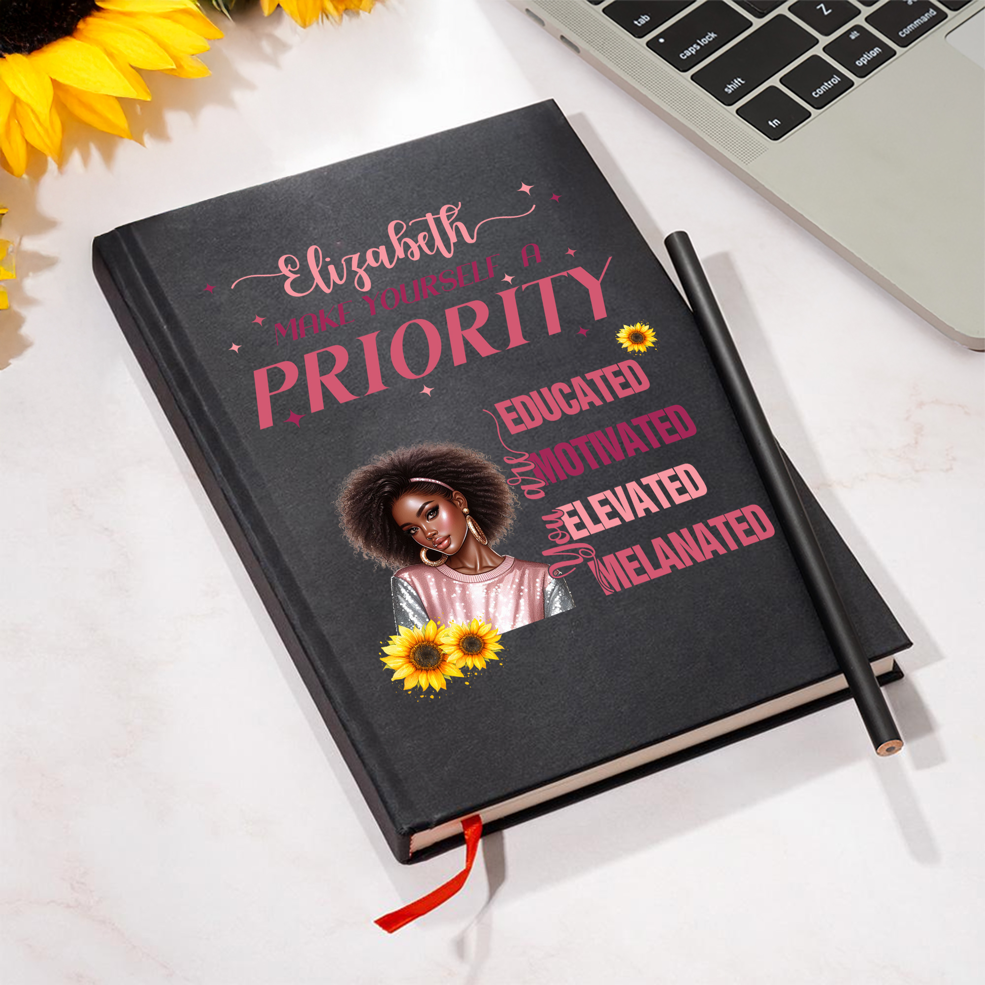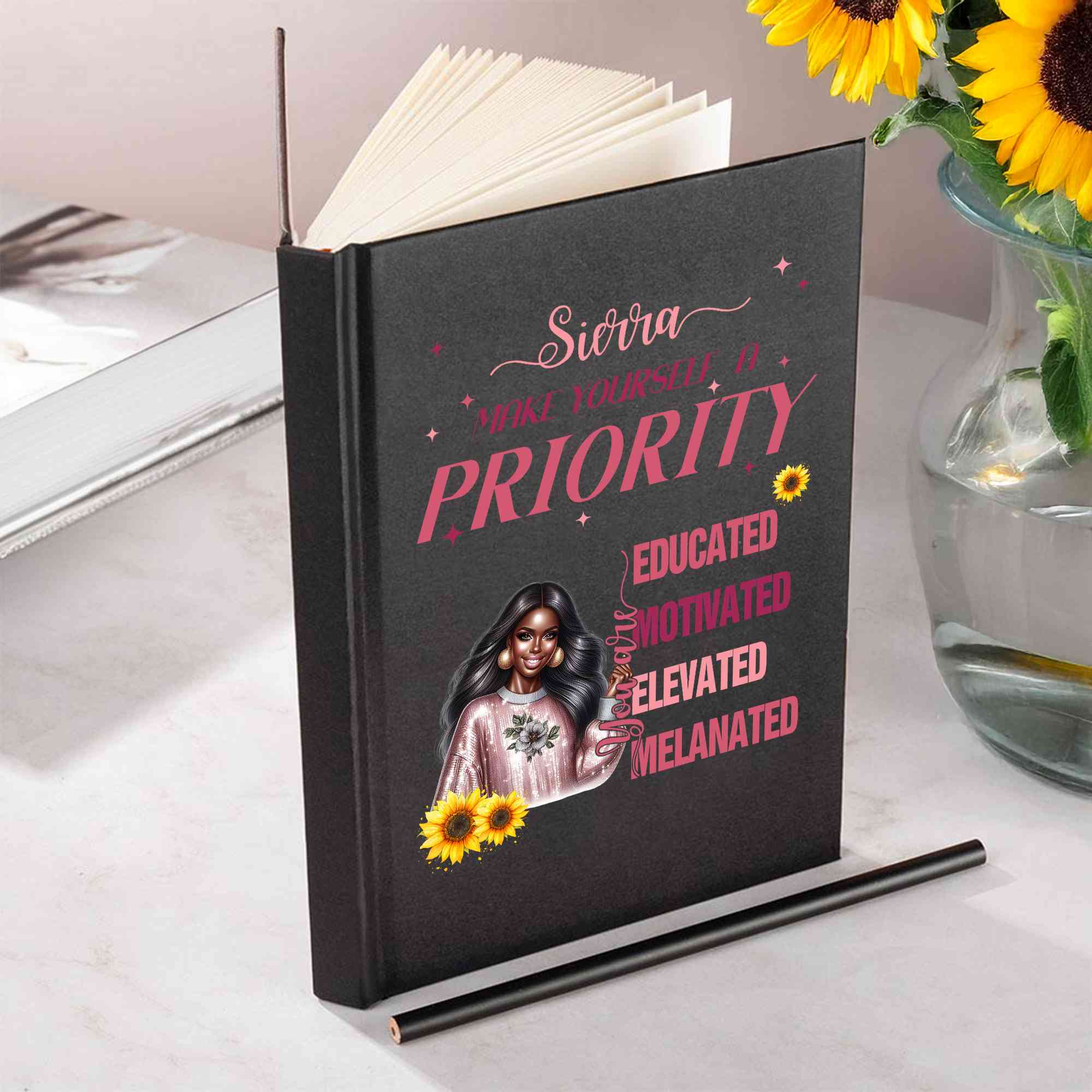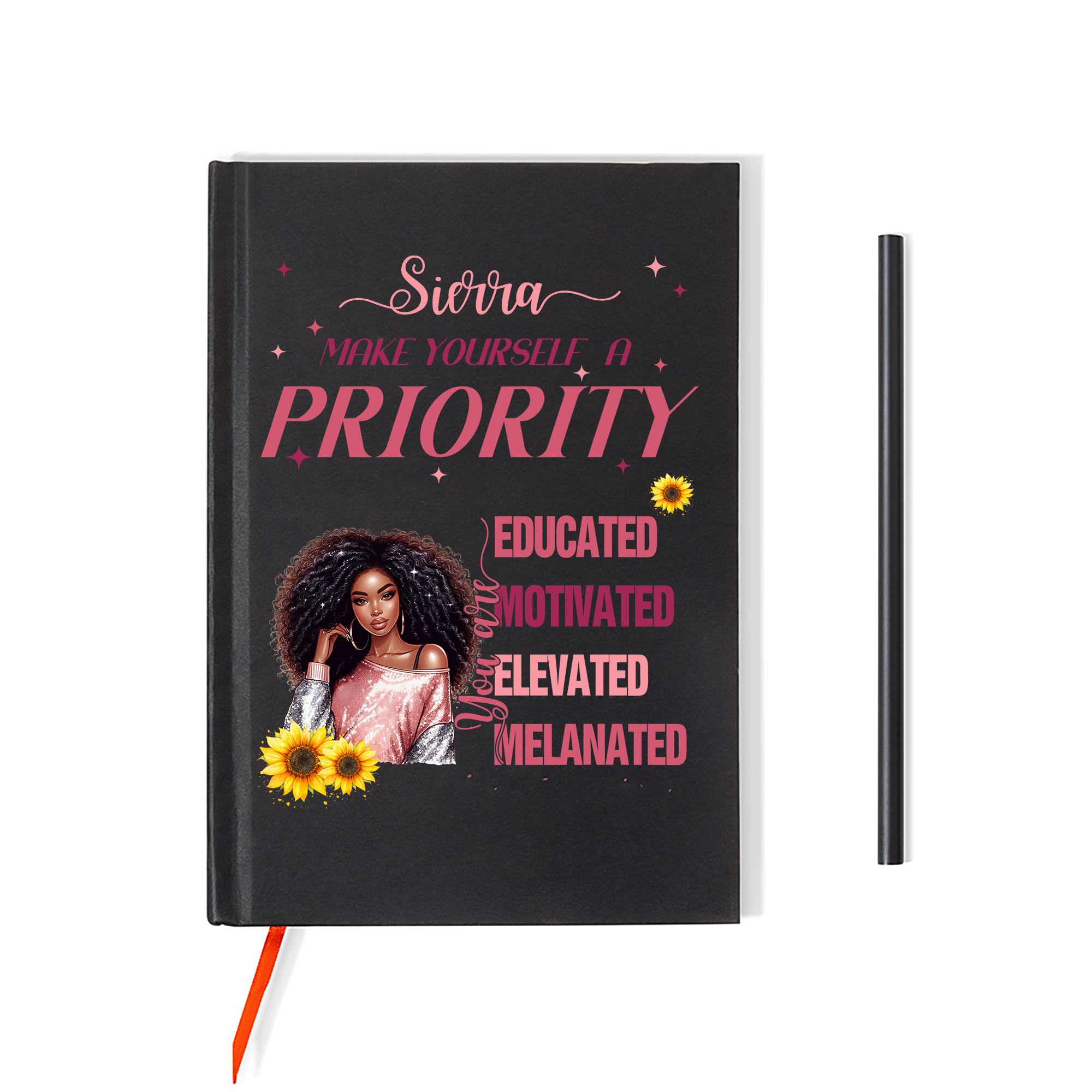 A personalized Black woman's confidence notebook. This notebook is designed specifically for Black women, meticulously designed and customized just for you. Choose from 16 character images on the cover, and customize your own name. The notebook comes in two colors, and comes with a free matching pencil.