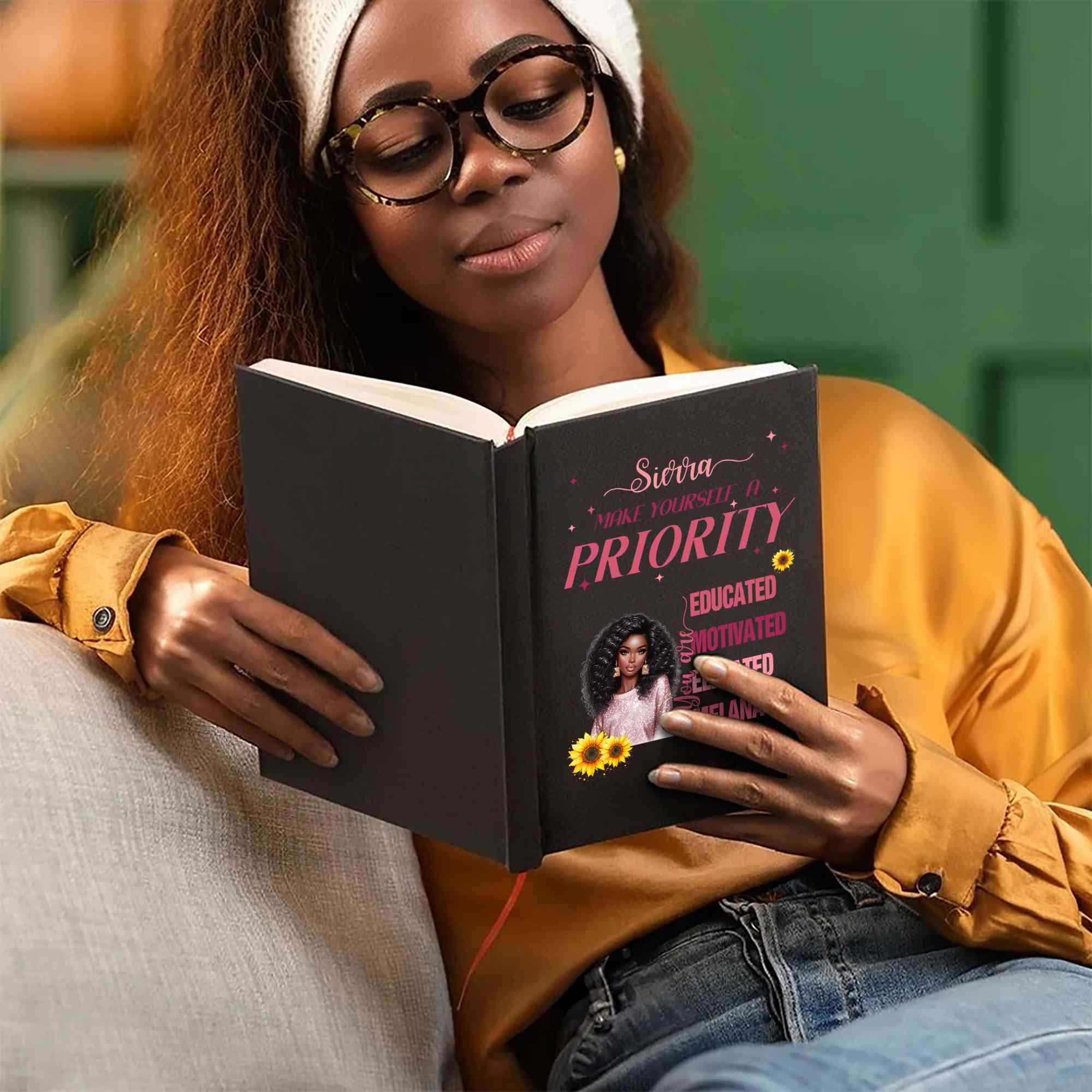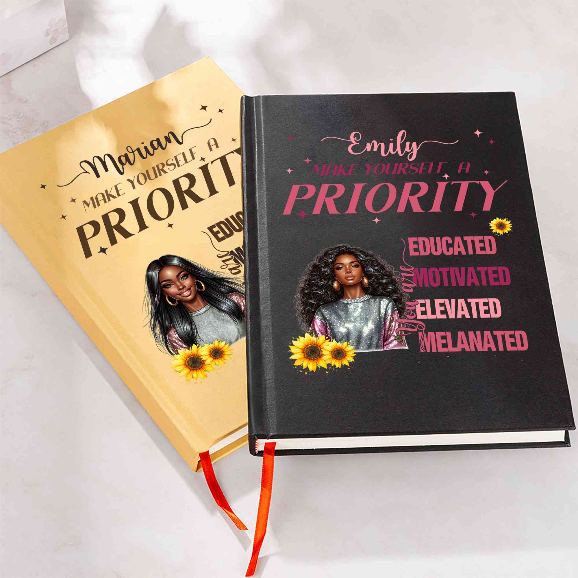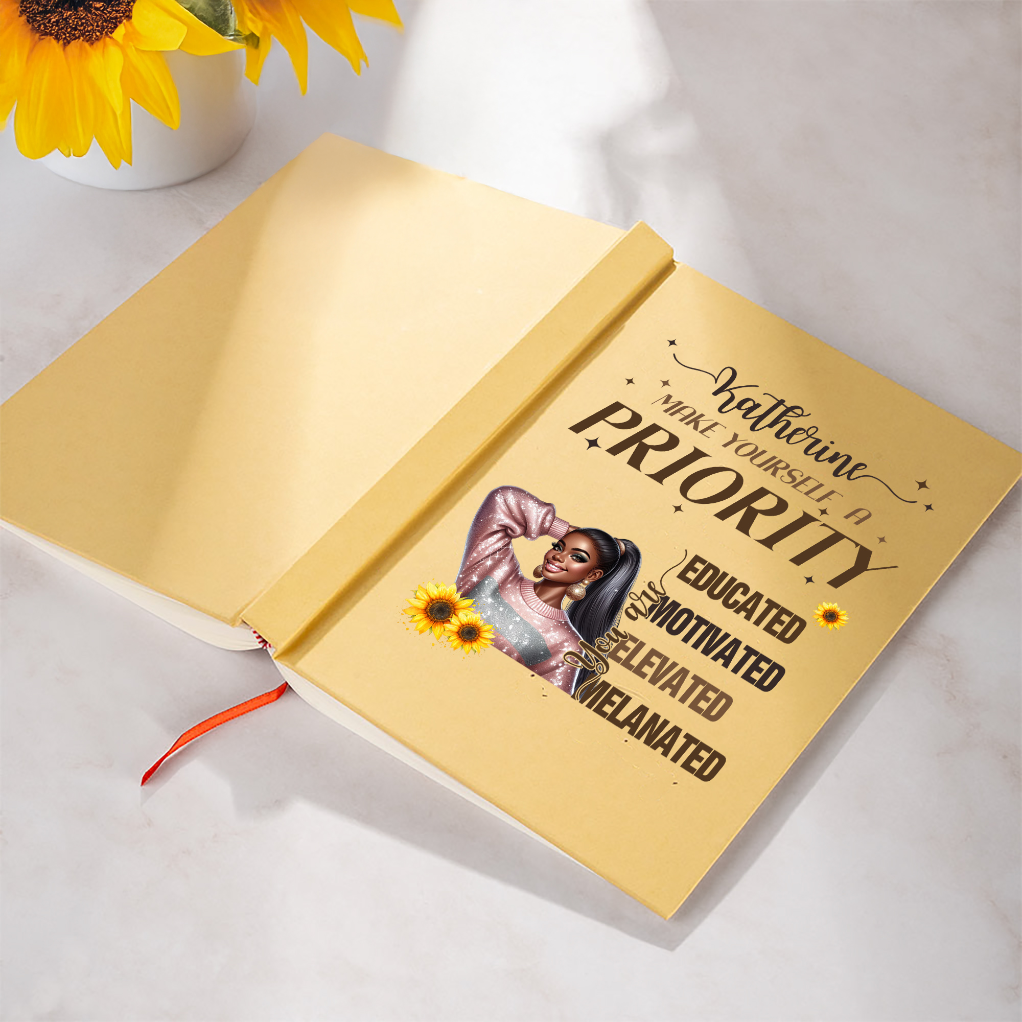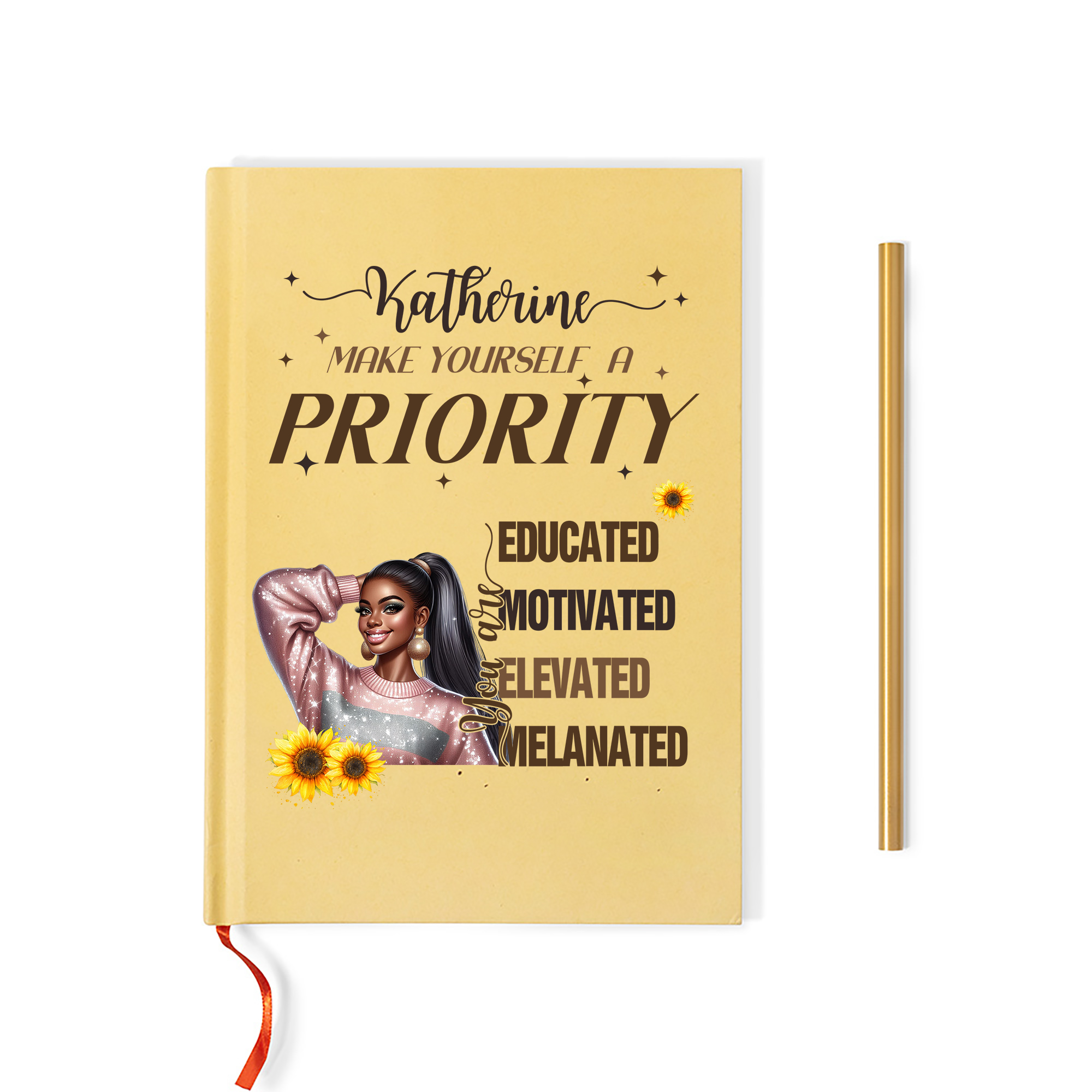 A personalized Black woman's confidence notebook. This notebook is designed specifically for Black women, meticulously designed and customized just for you. Choose from 16 character images on the cover, and customize your own name. The notebook comes in two colors, and comes with a free matching pencil.