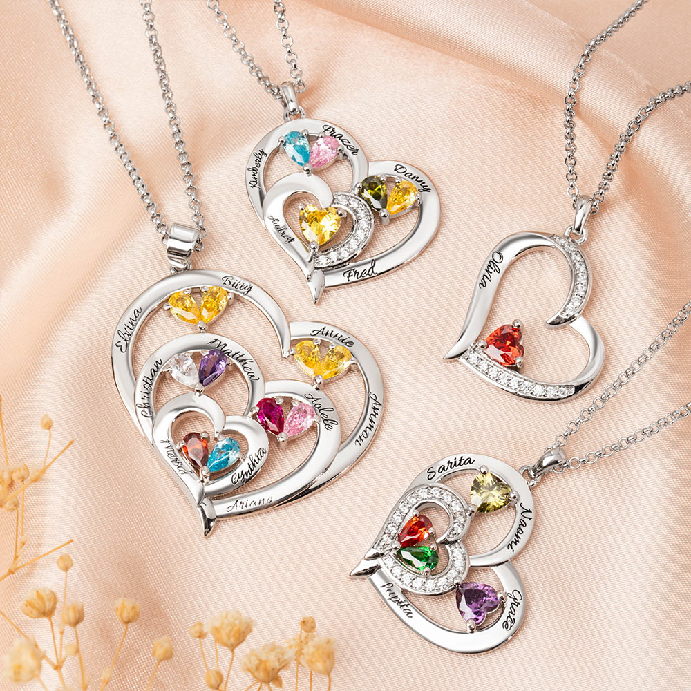 Celebrate family and love with our Personalized Engraved Family Necklace. Choose from 1 to 10 heart-shaped birthstones representing each family member, along with their names elegantly engraved.