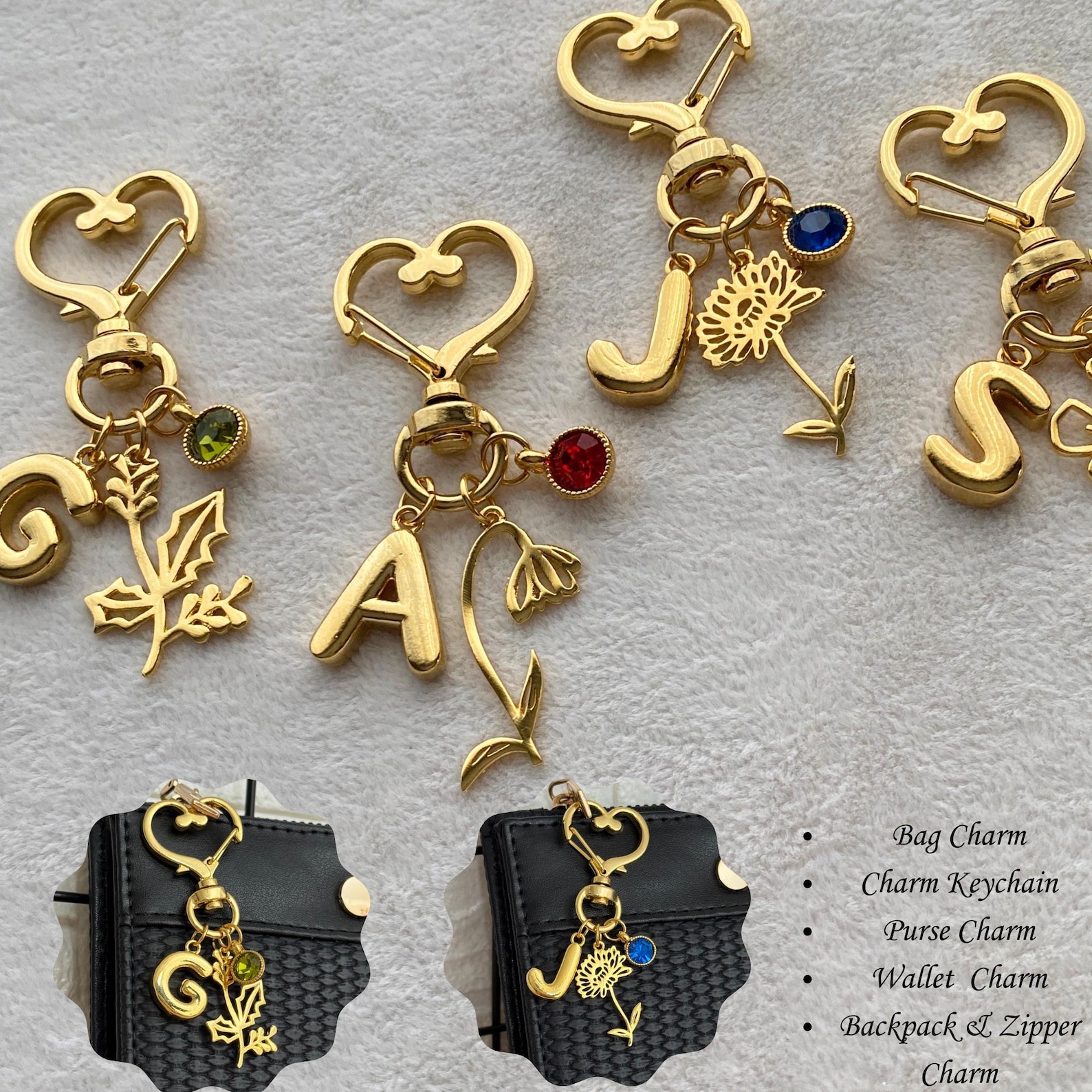 Personalized Birth Flower & Birthstone Heart Gold Keychain with Letter Charm, Unique Backpack Bag Purse Accessory, Birthday Gift for Her/Mom/Grandma