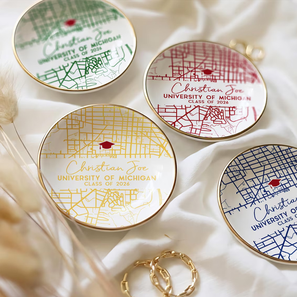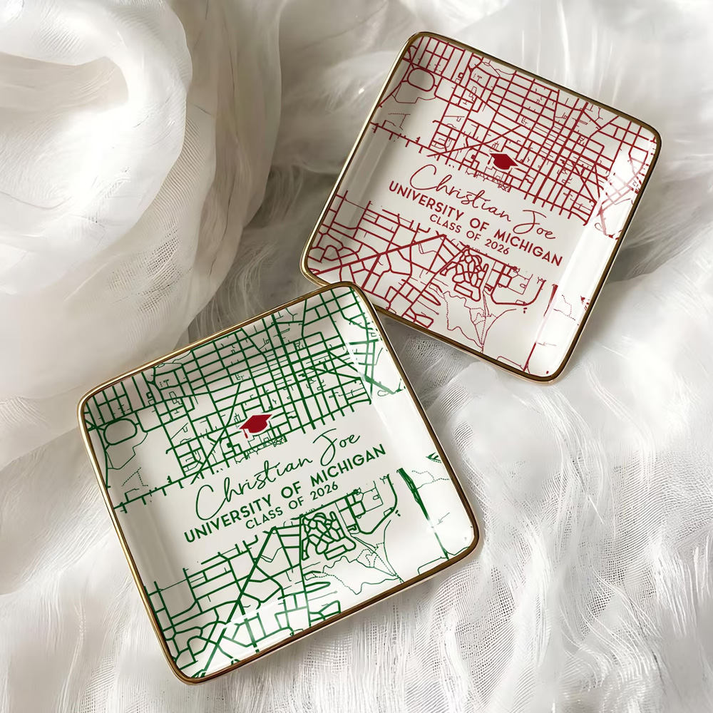 Custom Personalized Details - Each dish can be personalized with the graduate’s name, university name, and graduation year, creating a unique tribute to their academic journey. The custom text sits beautifully alongside the campus map, making the piece feel deeply personal and meaningful.