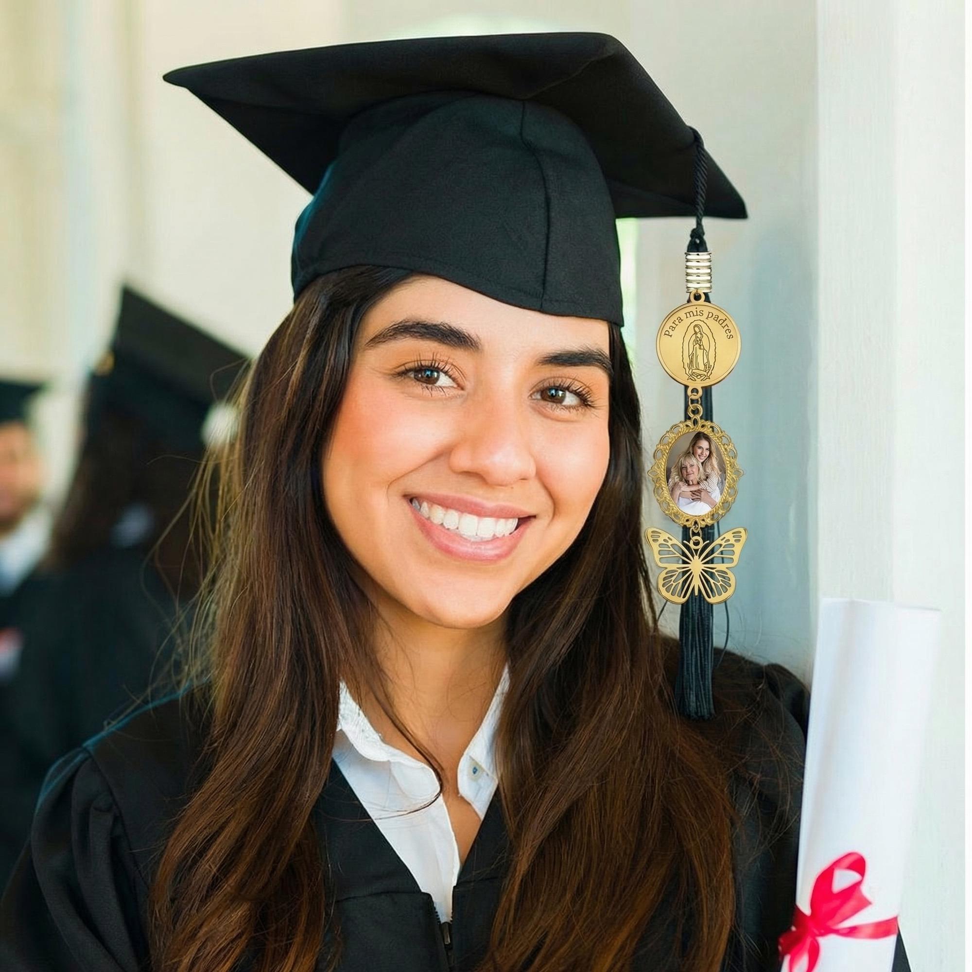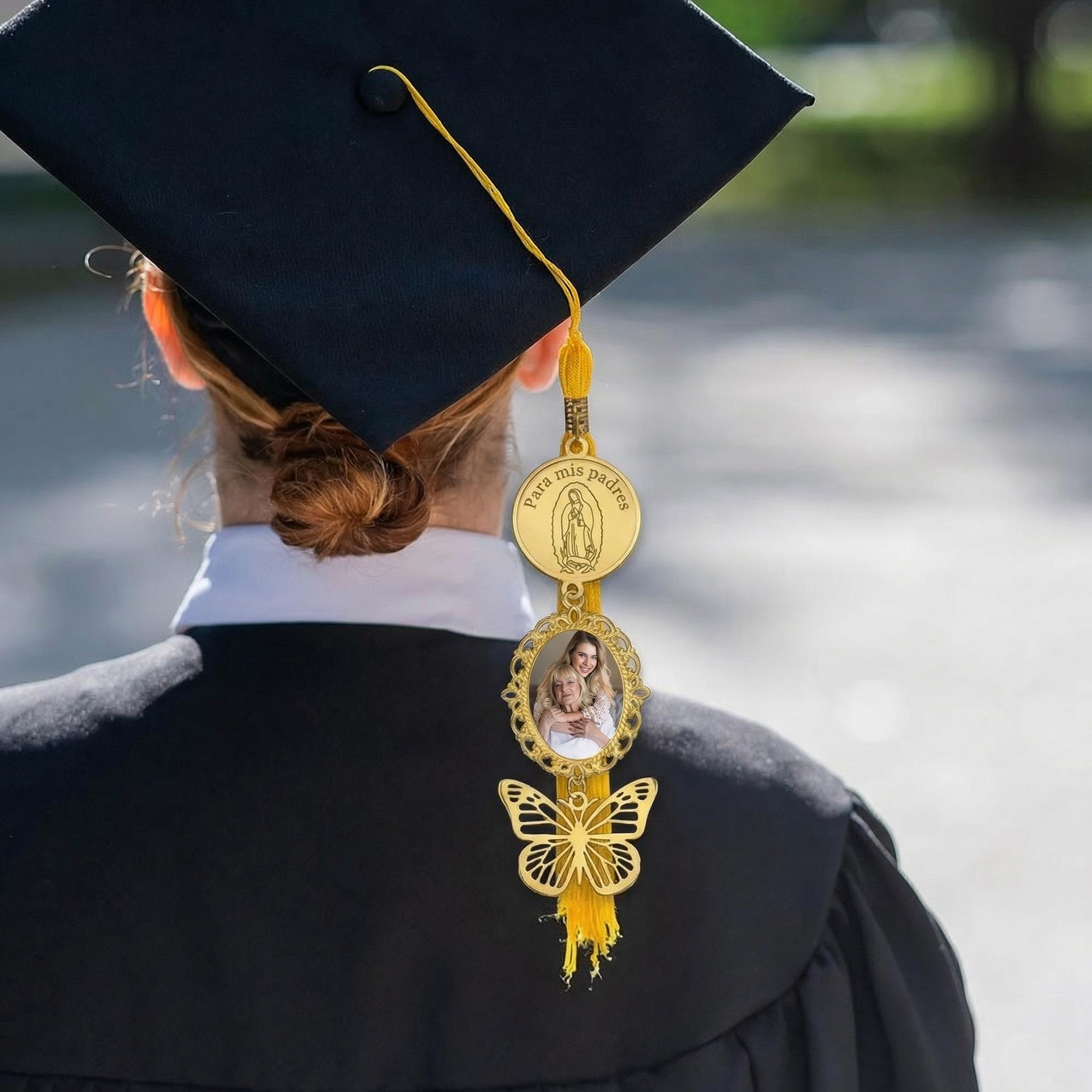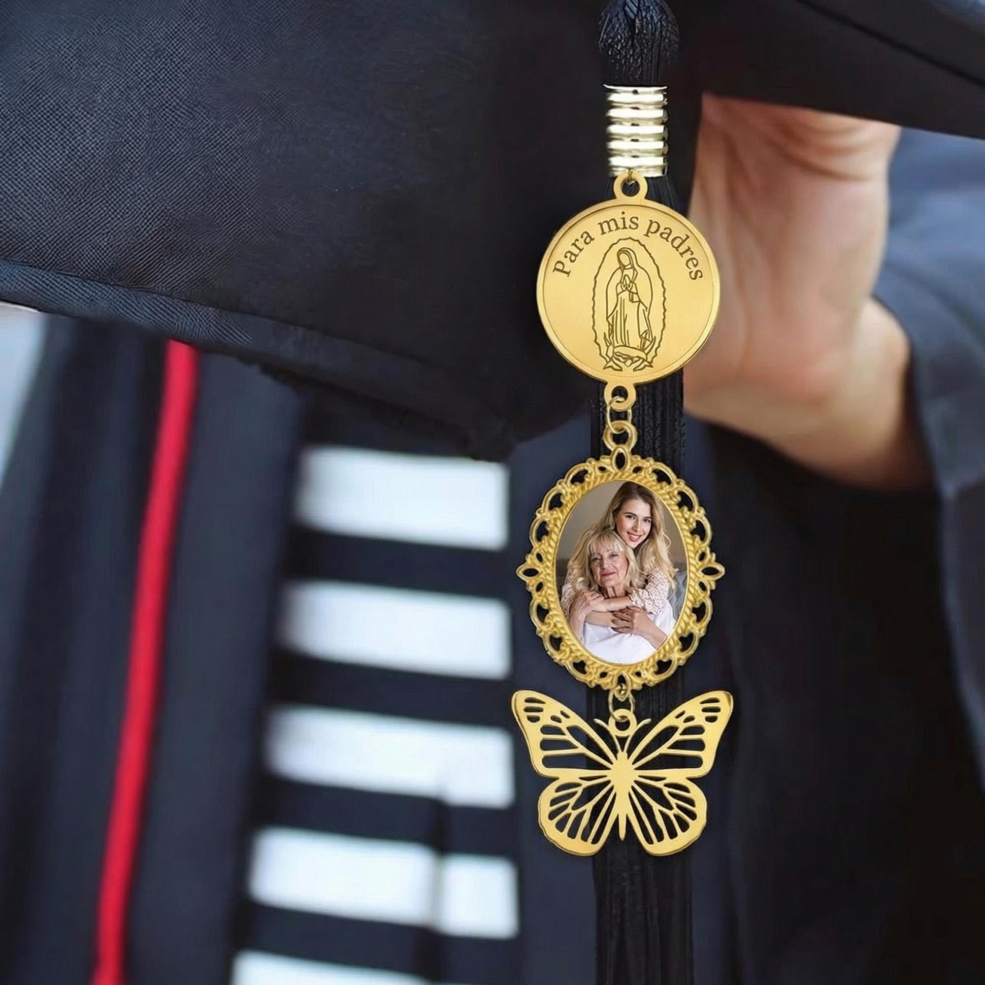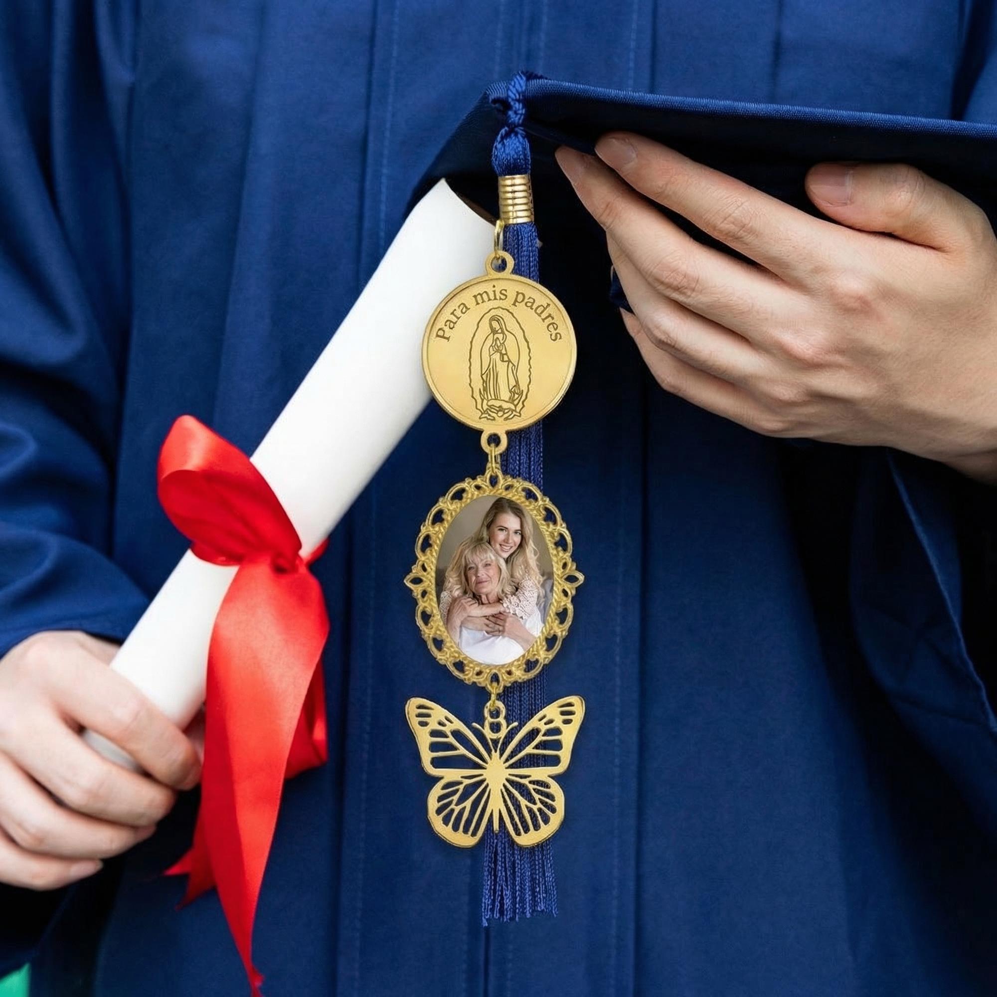This Personalized Catholic Graduation Tassel Charm combines spiritual symbolism and cherished memories in one elegant piece. Featuring a golden Virgin Mary medallion inscribed with “Para mis padres,” 1-3 cherished photos charm for your favorite memory, and a delicate butterfly charm, it’s a heartfelt tribute to faith, family, and the graduate’s journey.