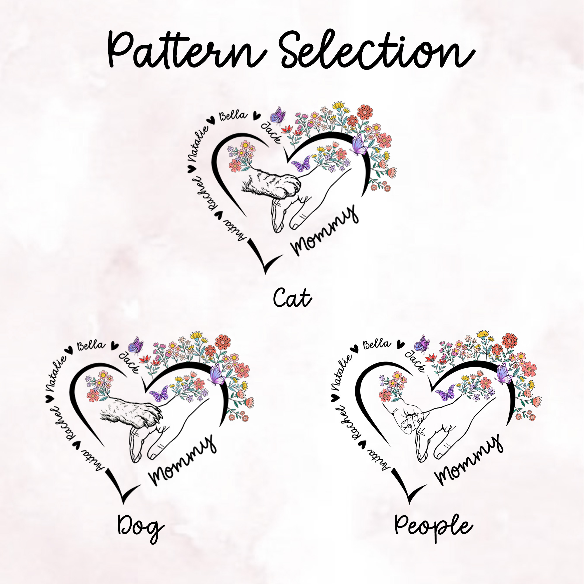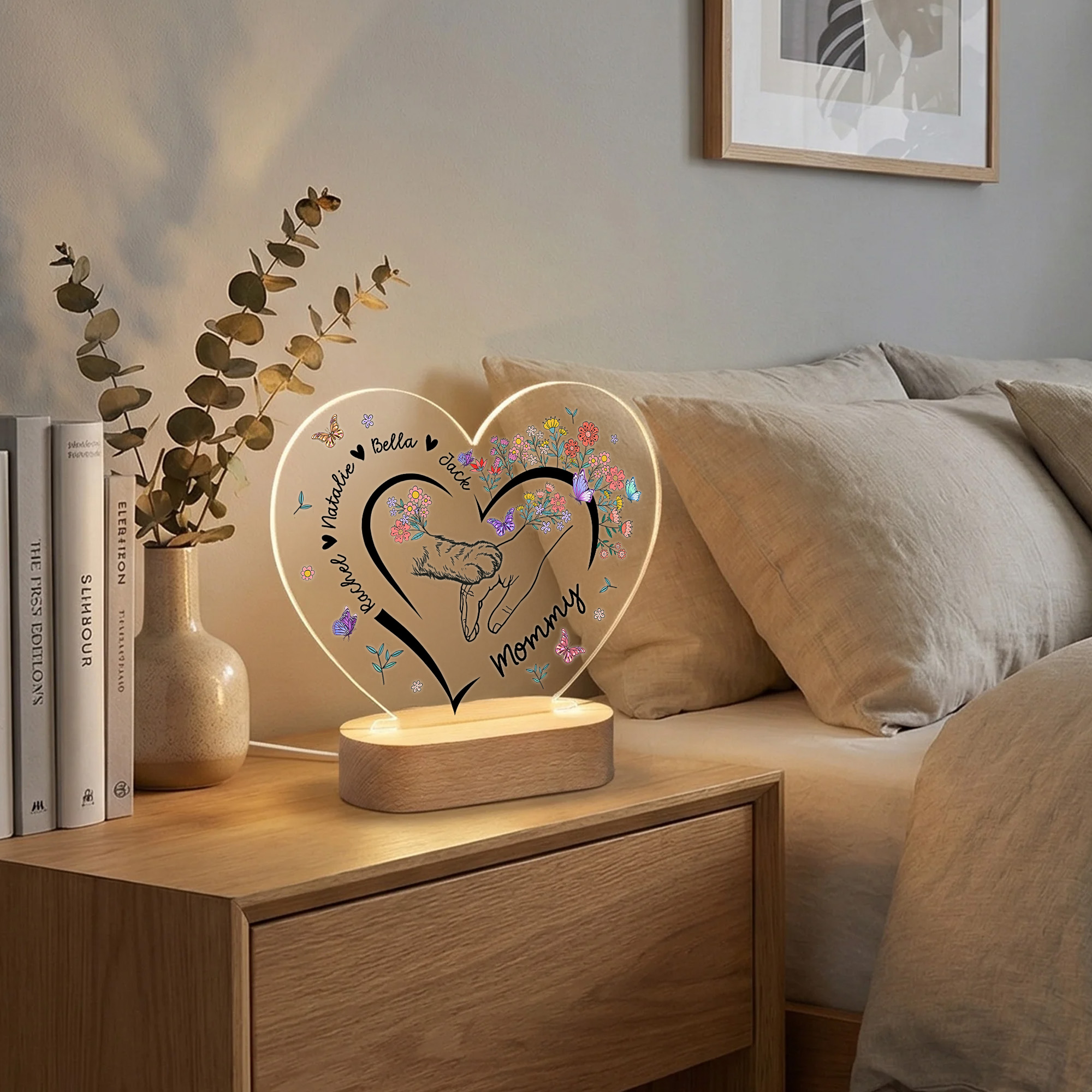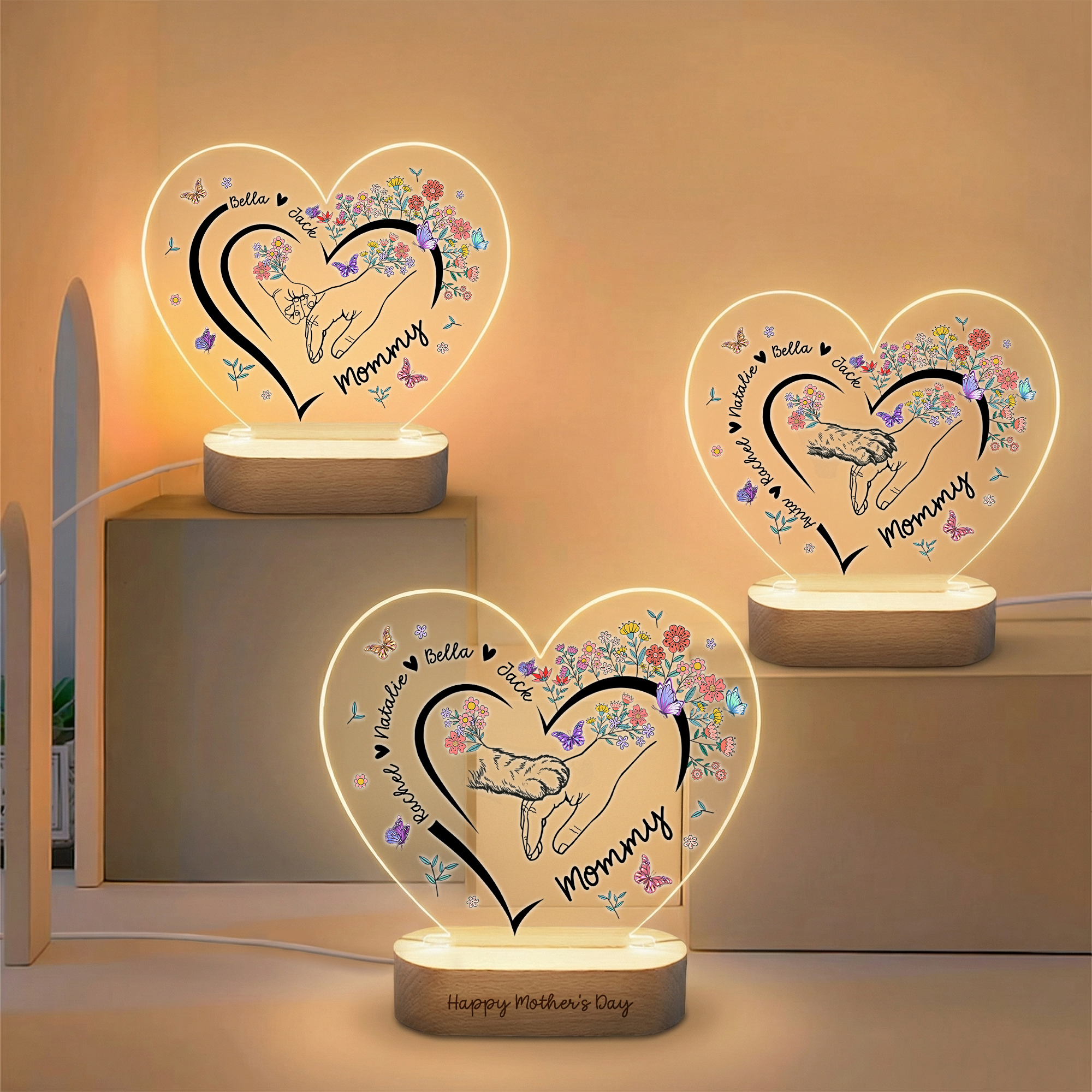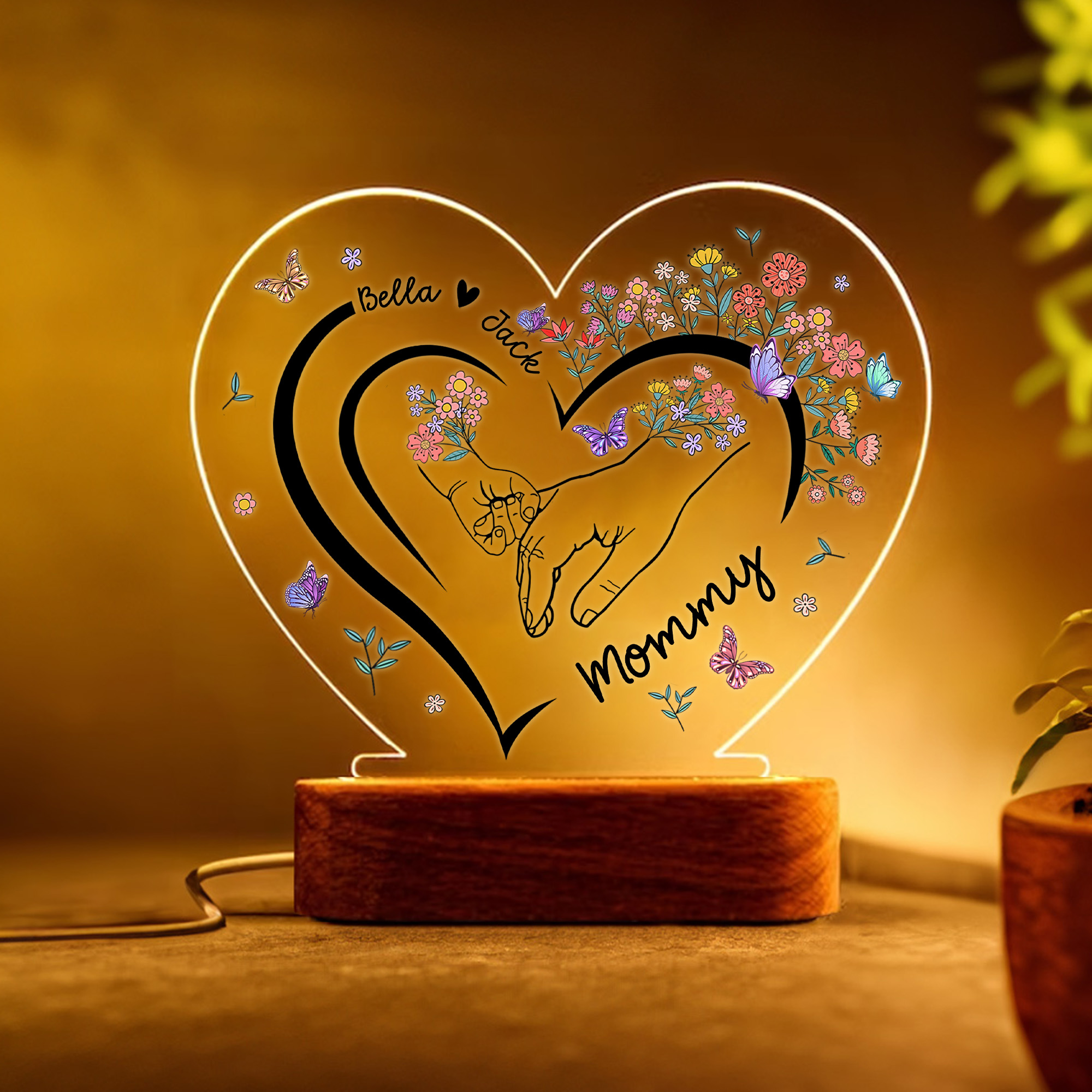 Heart-Shaped Light – This night light features a delicate heart-shaped acrylic panel adorned with blooming flowers and fluttering butterflies. At the center, two hands gently meet, symbolizing love and connection between mother and child.