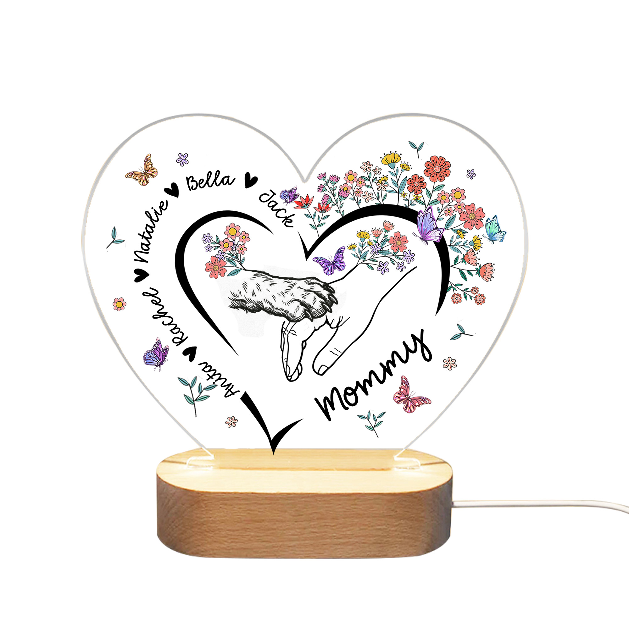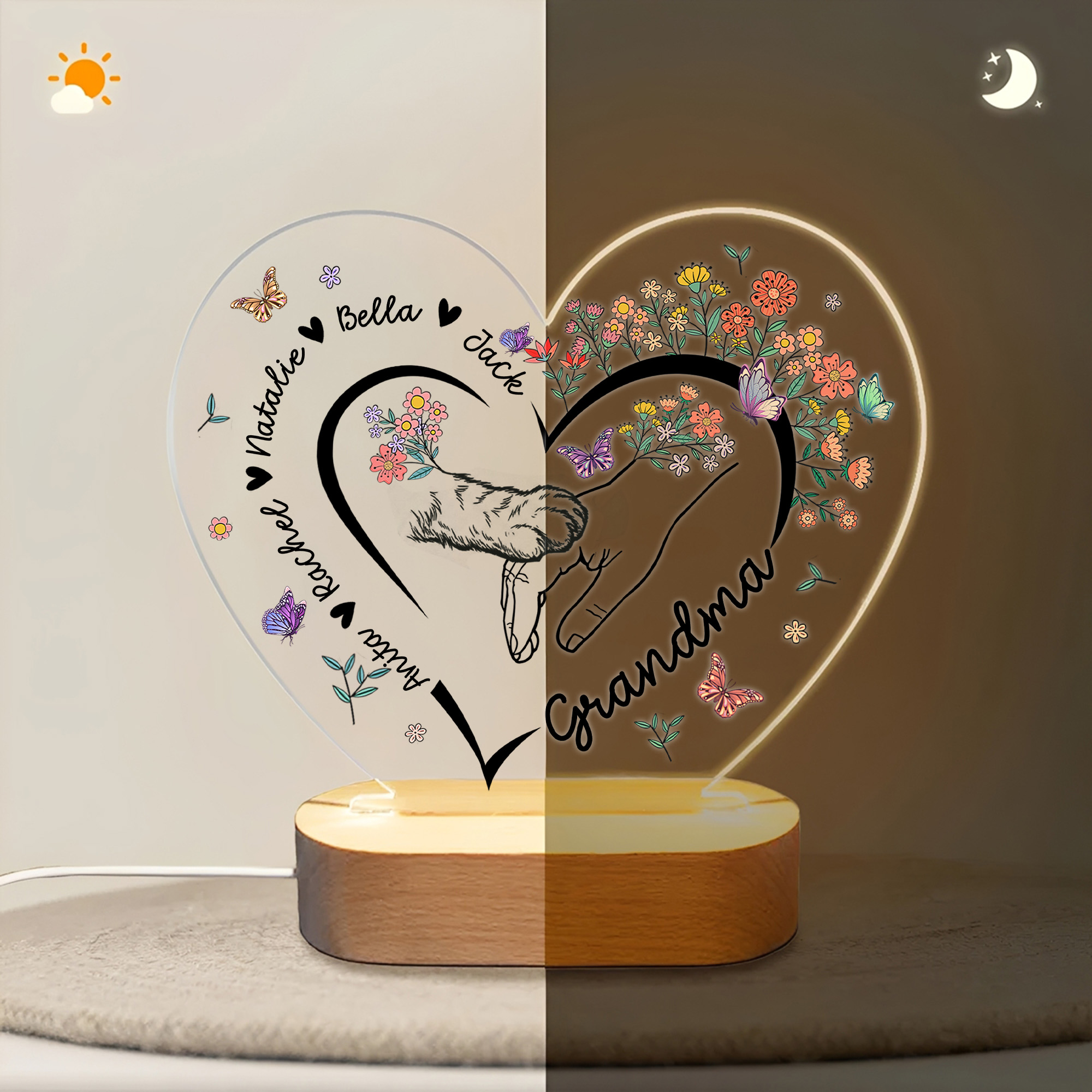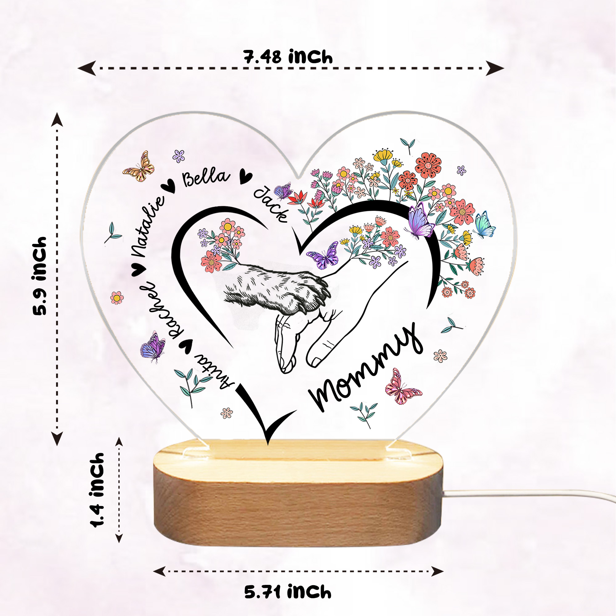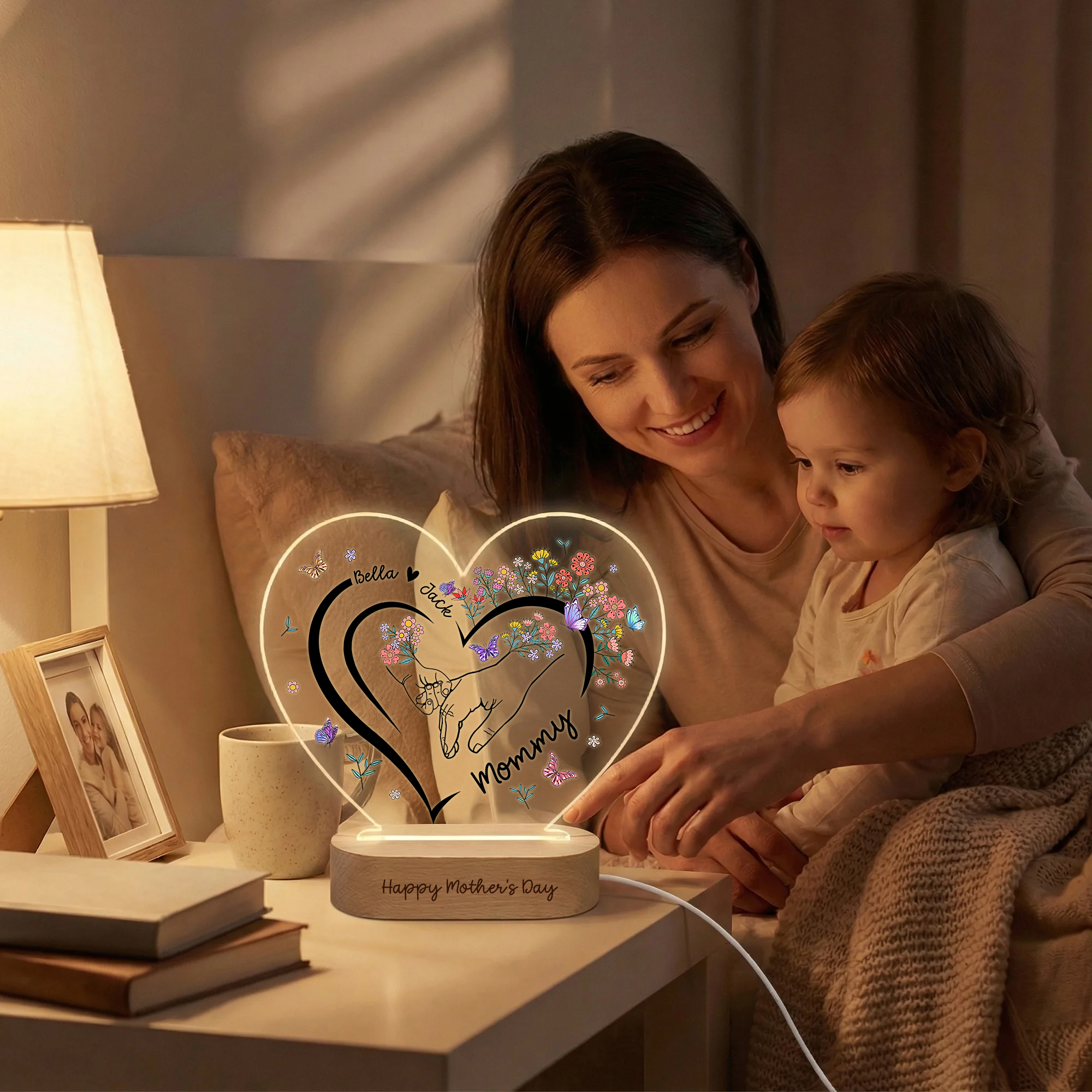 Personalized Floral Handprint Love Heart-Shaped LED Night Light with Names, Acrylic Night Lamp with Wooden Base, Mother’s Day Gift for Mom/Grandma/Her