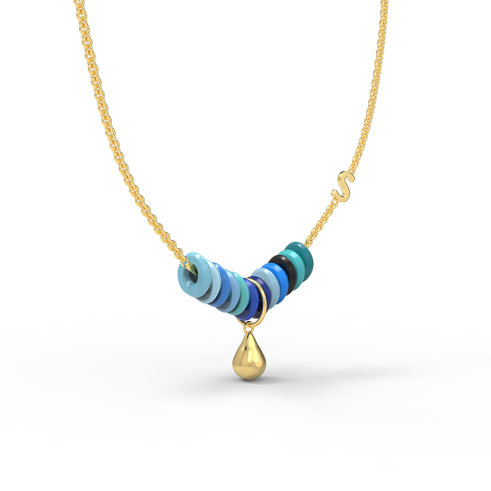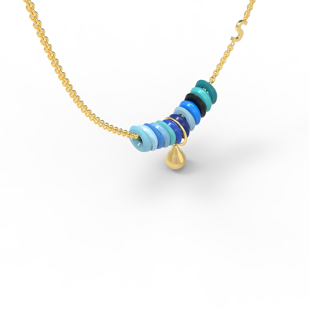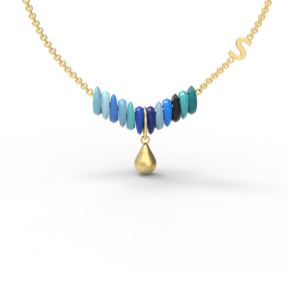 With a metal drop and stones in different kinds of beautiful blue, this necklace is full of Bohemian touch. The water drop is a highlight to this necklace, for its simple while elegant shape and the associated meaning about purity. The sideway initial can personalize to reveal something about the wearer.