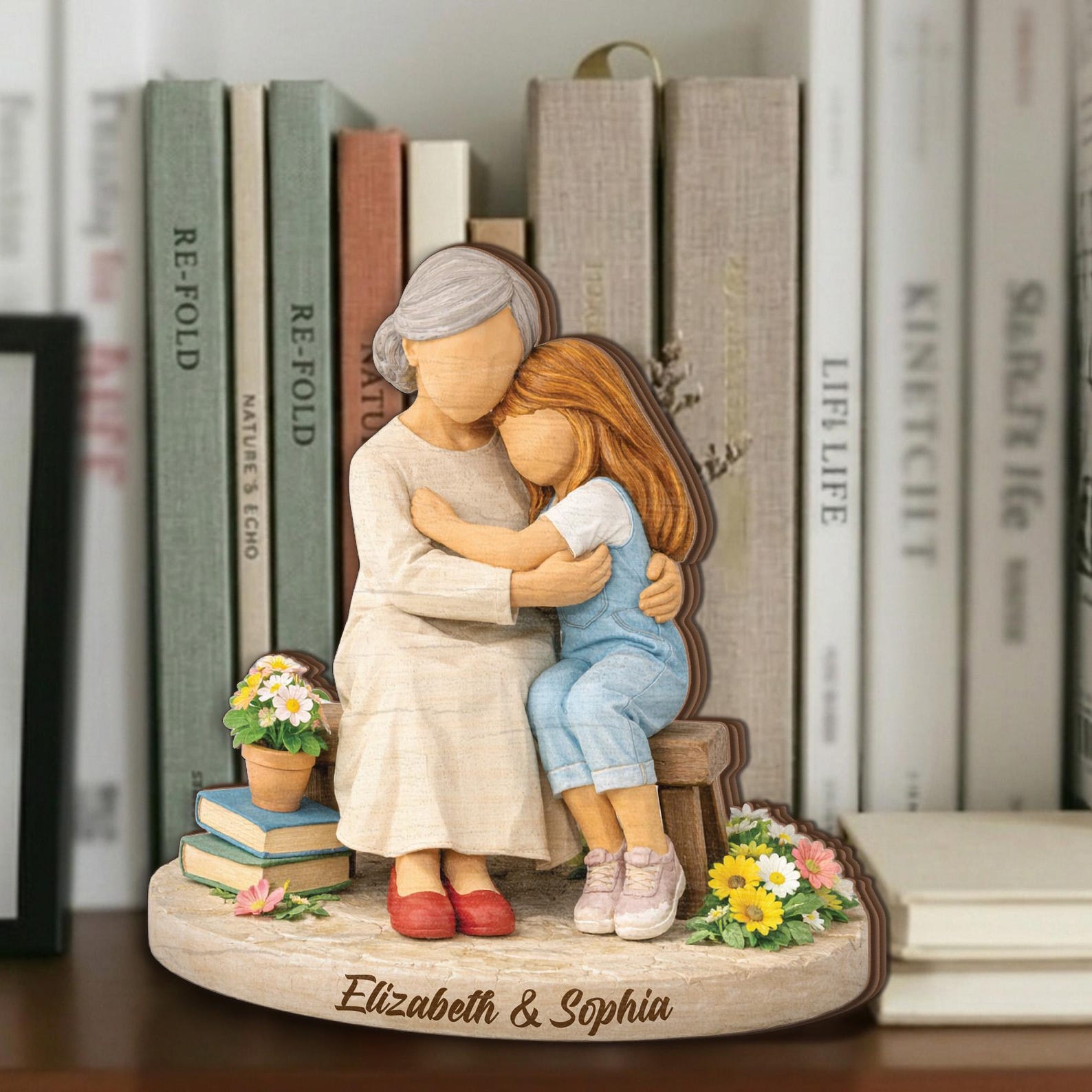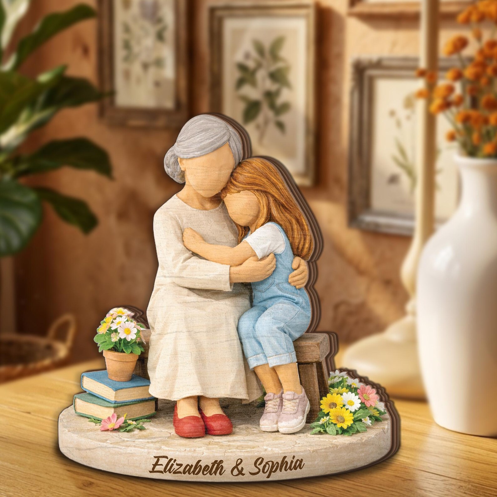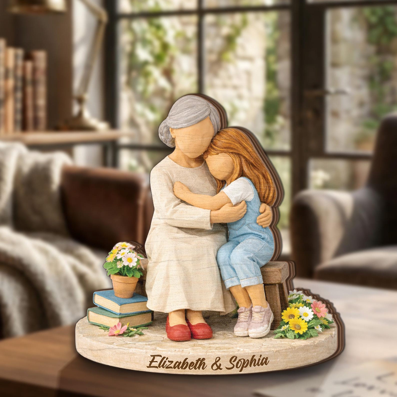 Tender Hug Design – This handcrafted wooden plaque captures a quiet, loving embrace between a mother and daughter. The soft, lifelike carving conveys deep affection, comfort, and the timeless bond of family. Delicate floral accents and stacked books at their feet add a touch of everyday warmth and nostalgia.