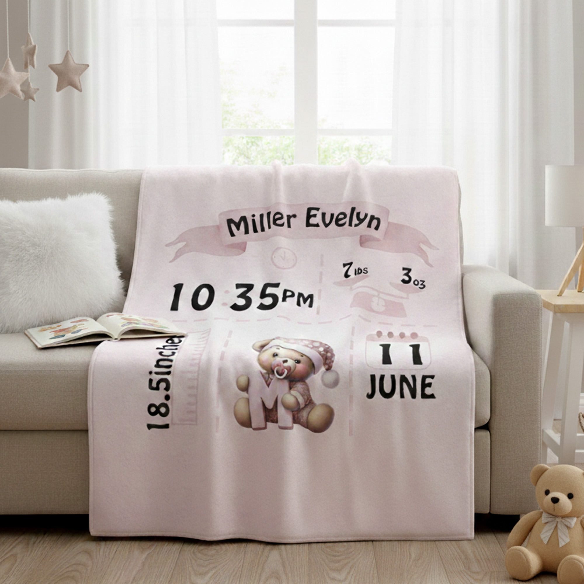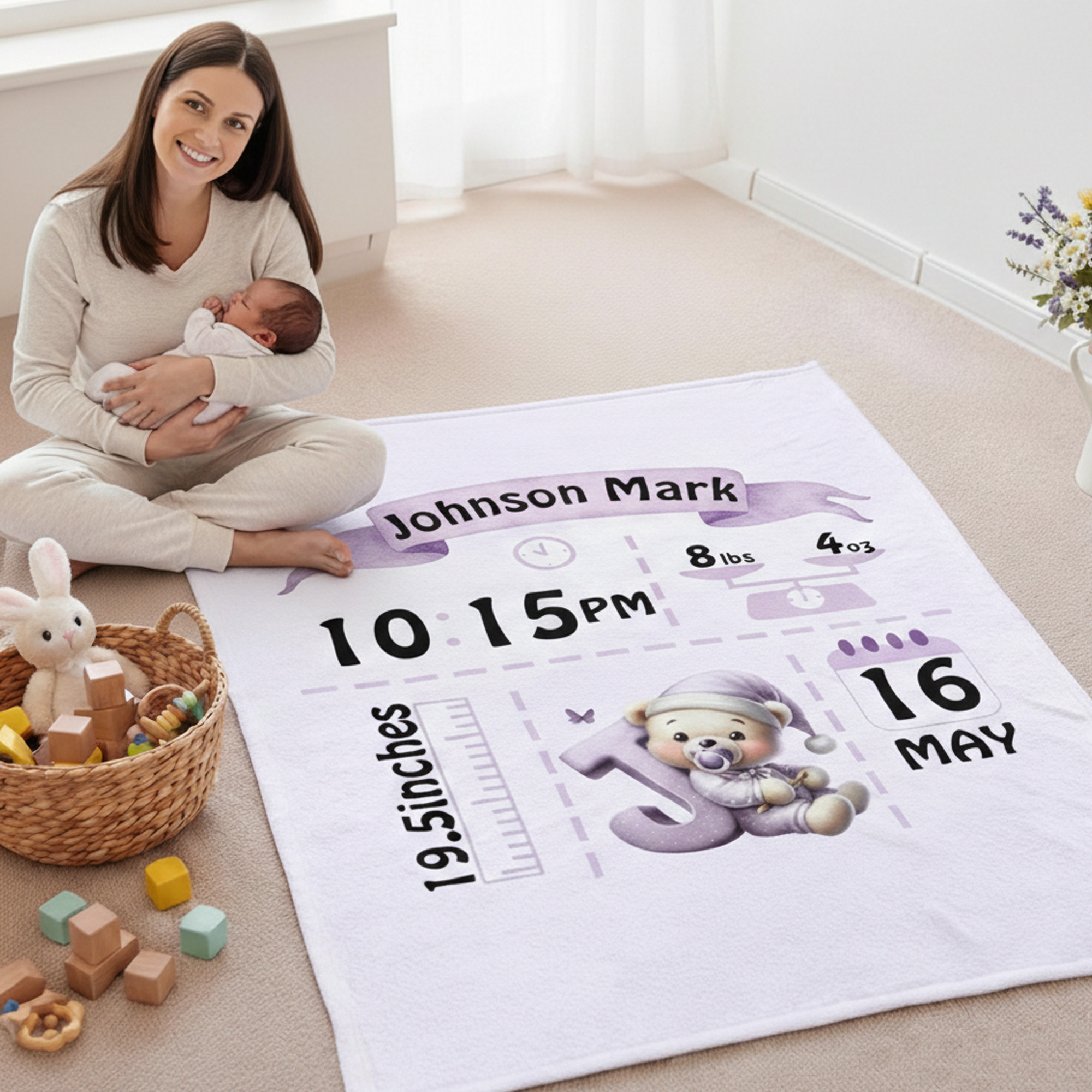 | Style | Personalized Name Bear Design Baby Birth Stats Blanket |