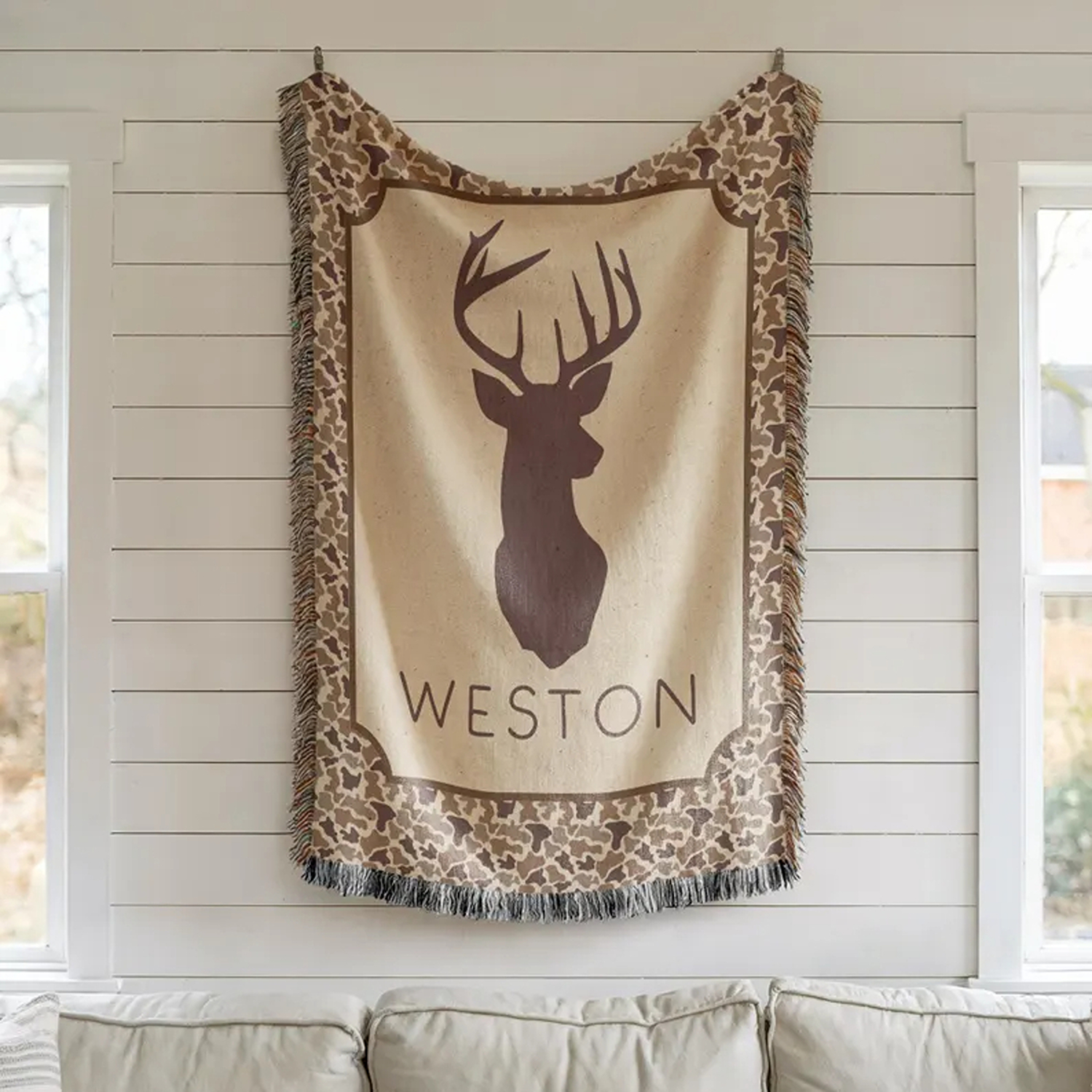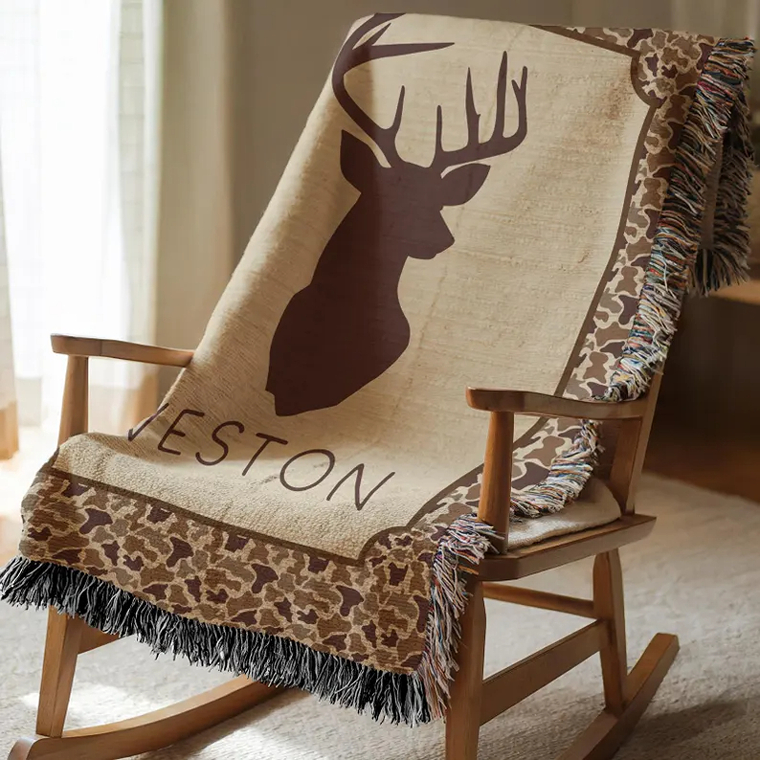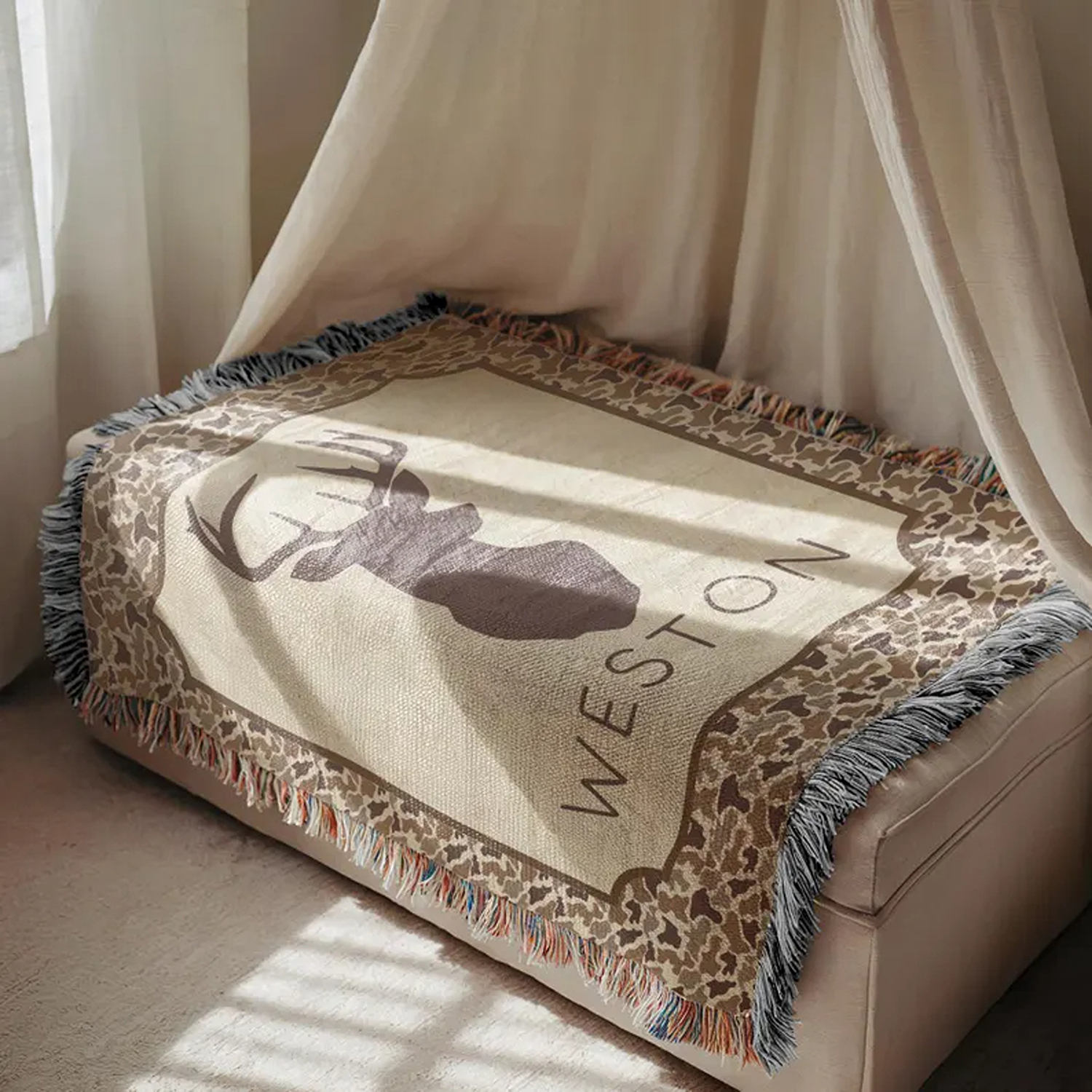 Deer Camo Name Blanket - A cozy woven throw featuring a bold deer silhouette centered with a personalized name, framed by rustic camouflage-patterned borders and finished with colorful tassels—blending woodland charm, heritage pride, and tender personalization.