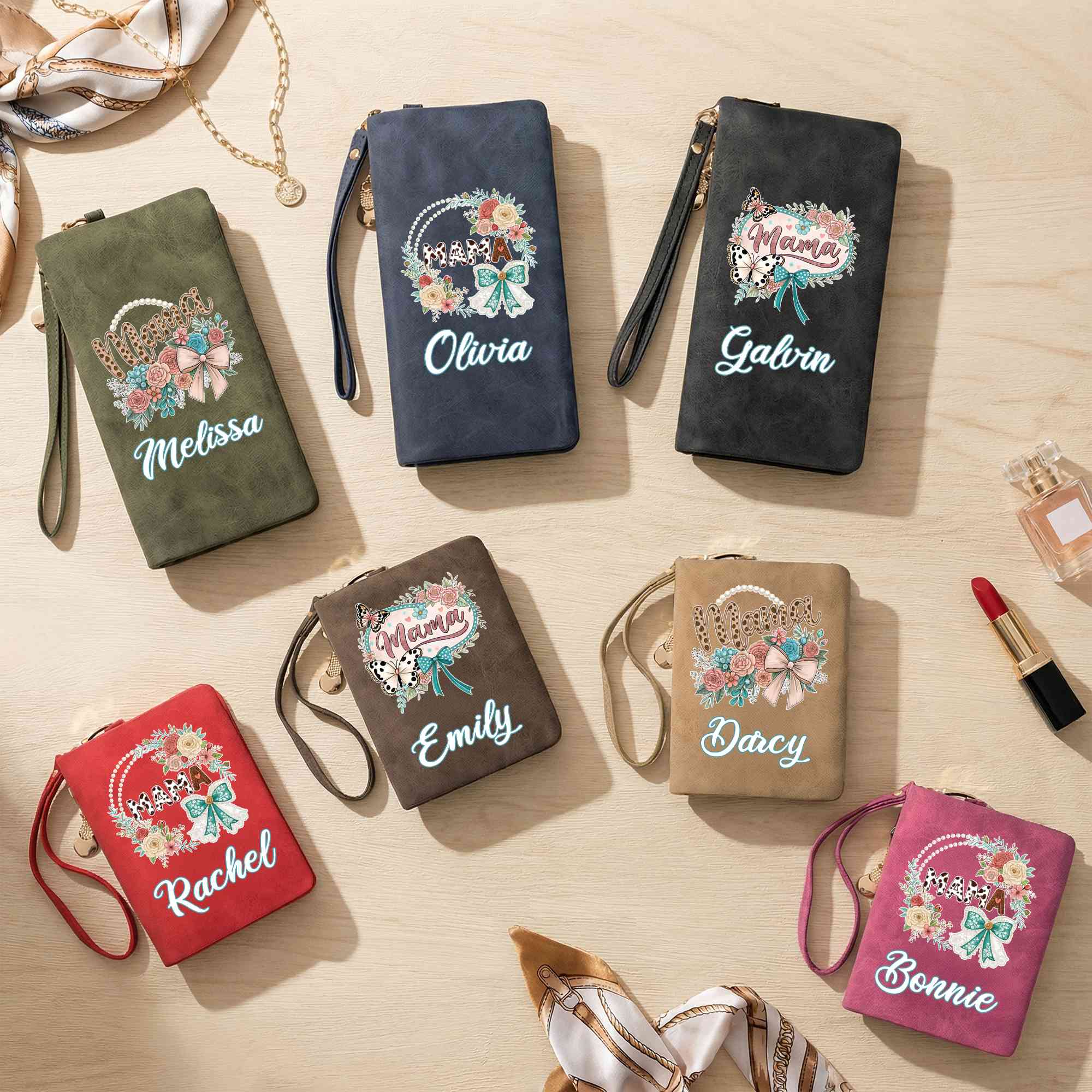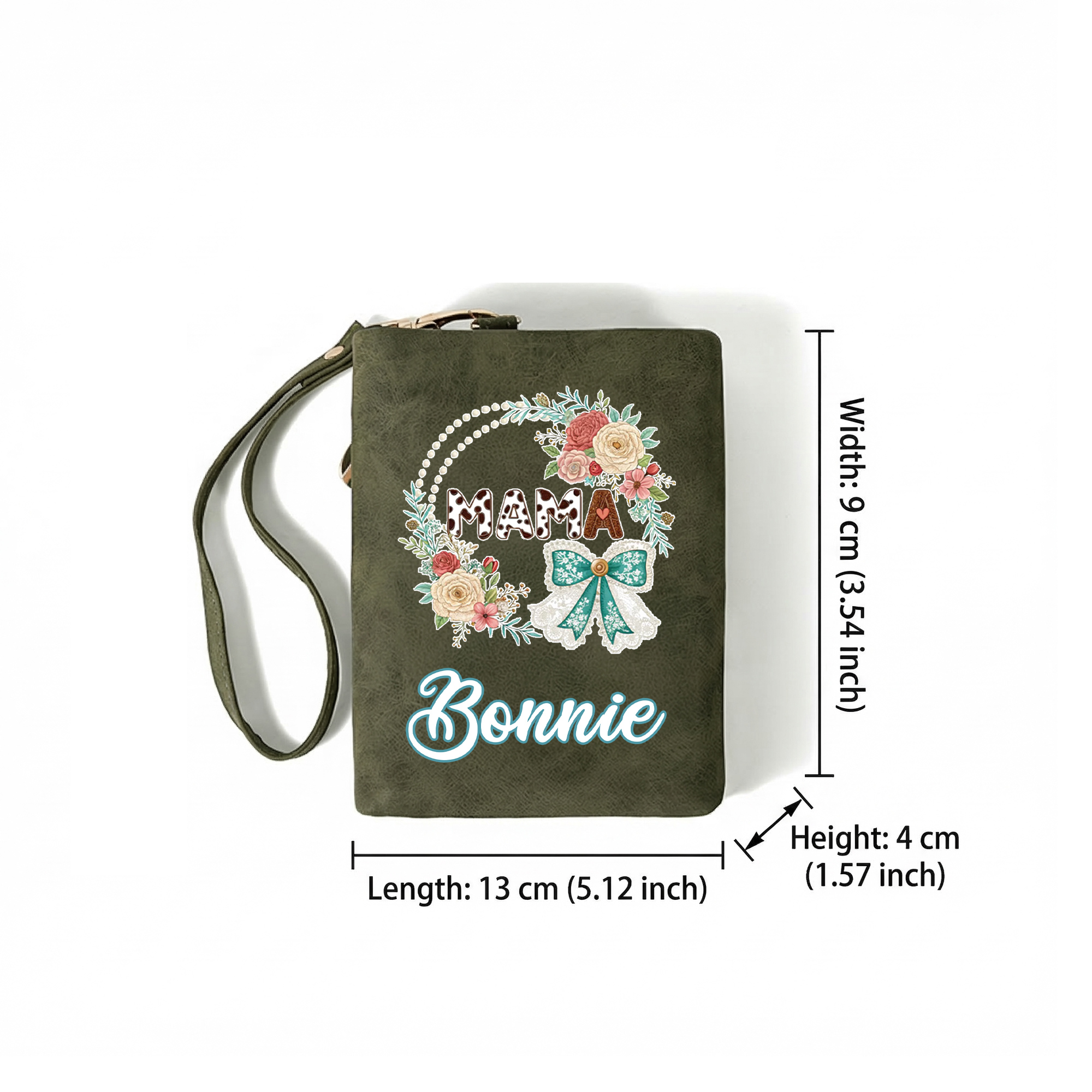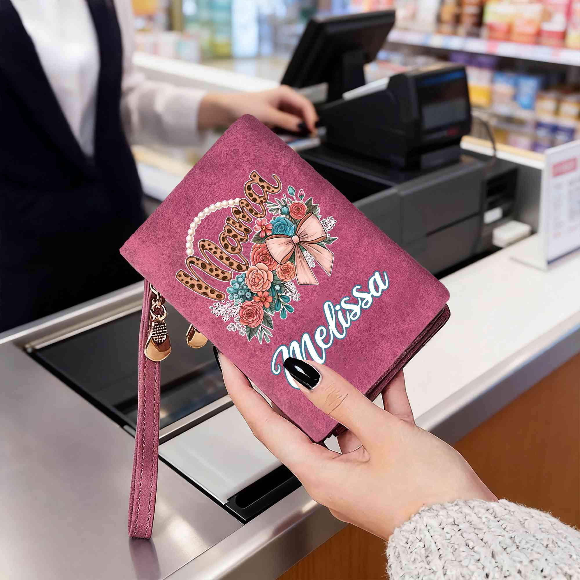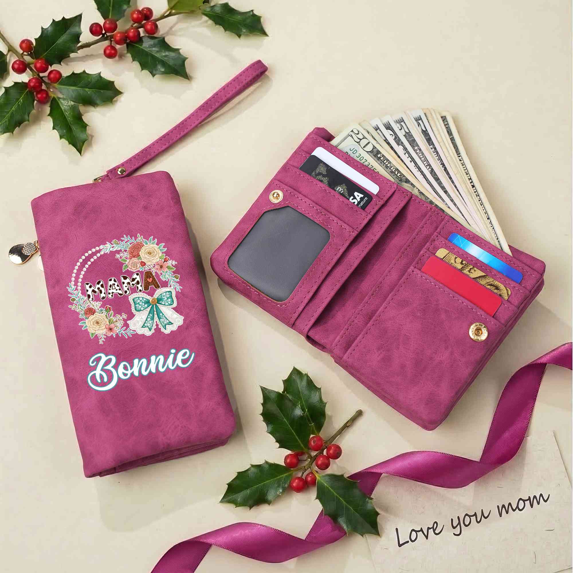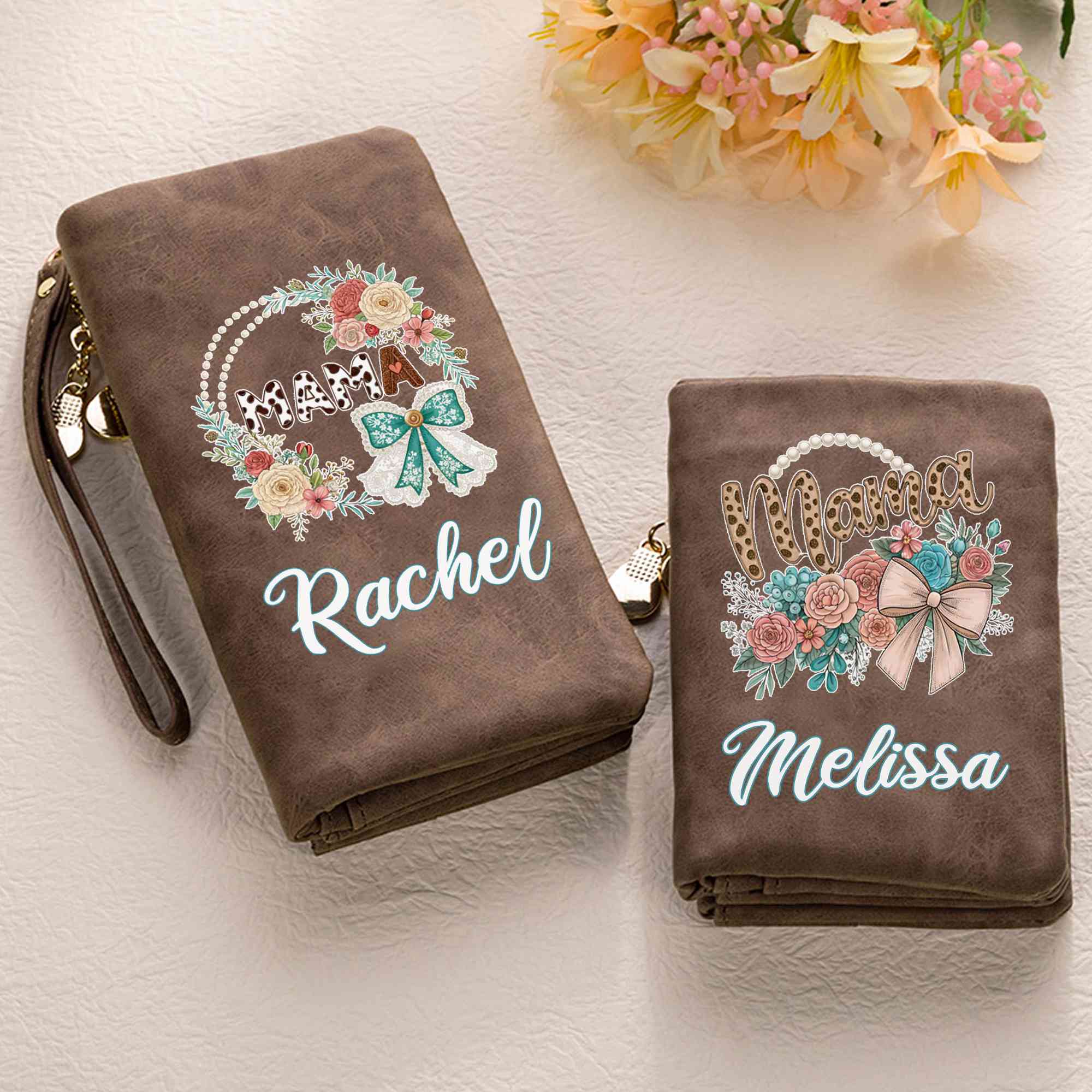 Personalized Name Floral Bow Mama Design Tri-Fold Wallet, Leather Wallet Card Phone Holder with Wristlet, Birthday/Mother’s Day Gift for Mom/Grandma