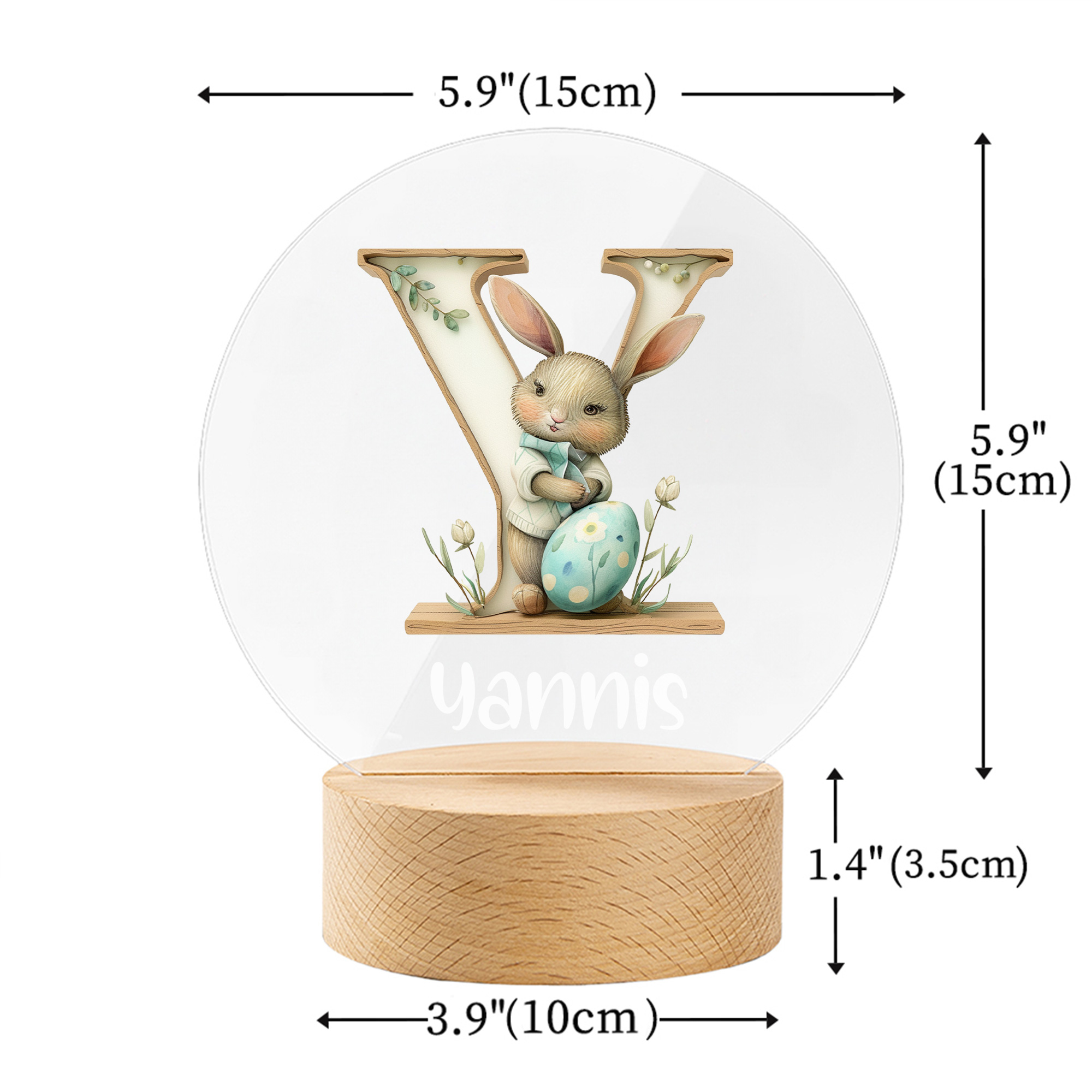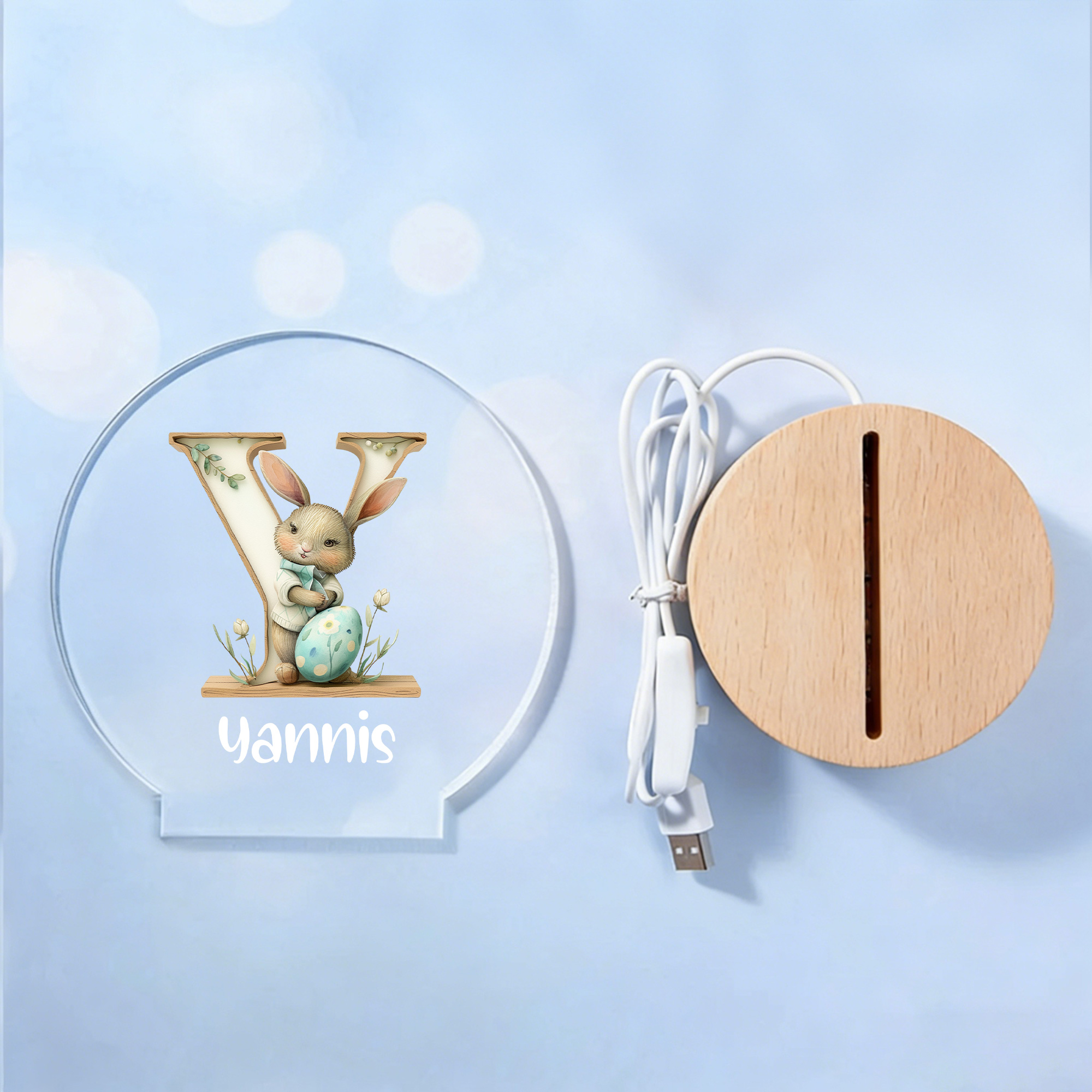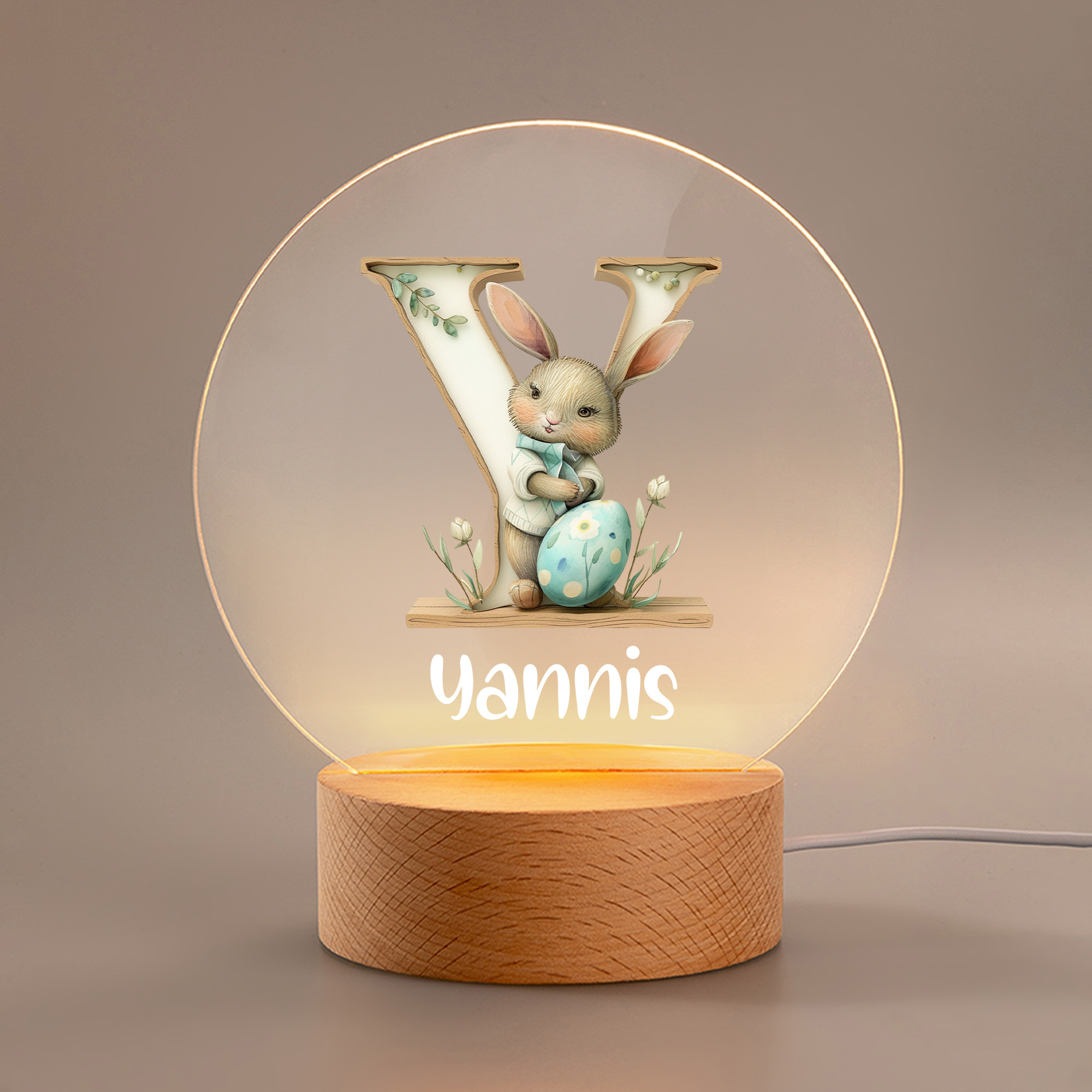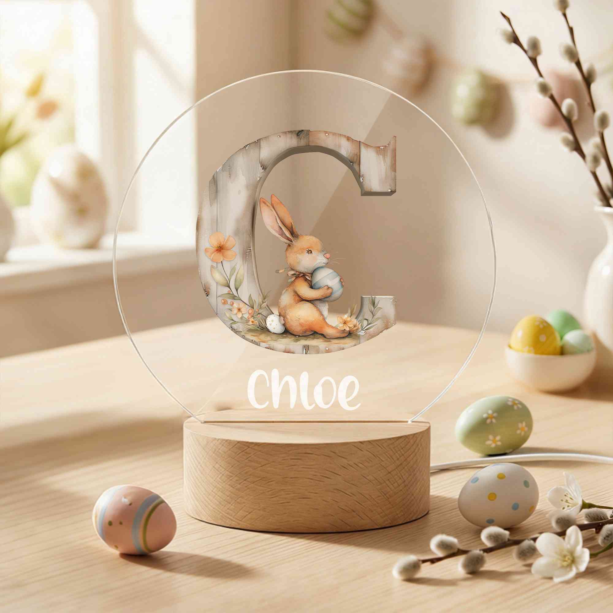 Personalized Name Floral Bunny Watercolor Alphabet LED Night Light, Acrylic Night Lamp with Wooden Base, Nursery Decor, Easter/Birthday Gift for Kids