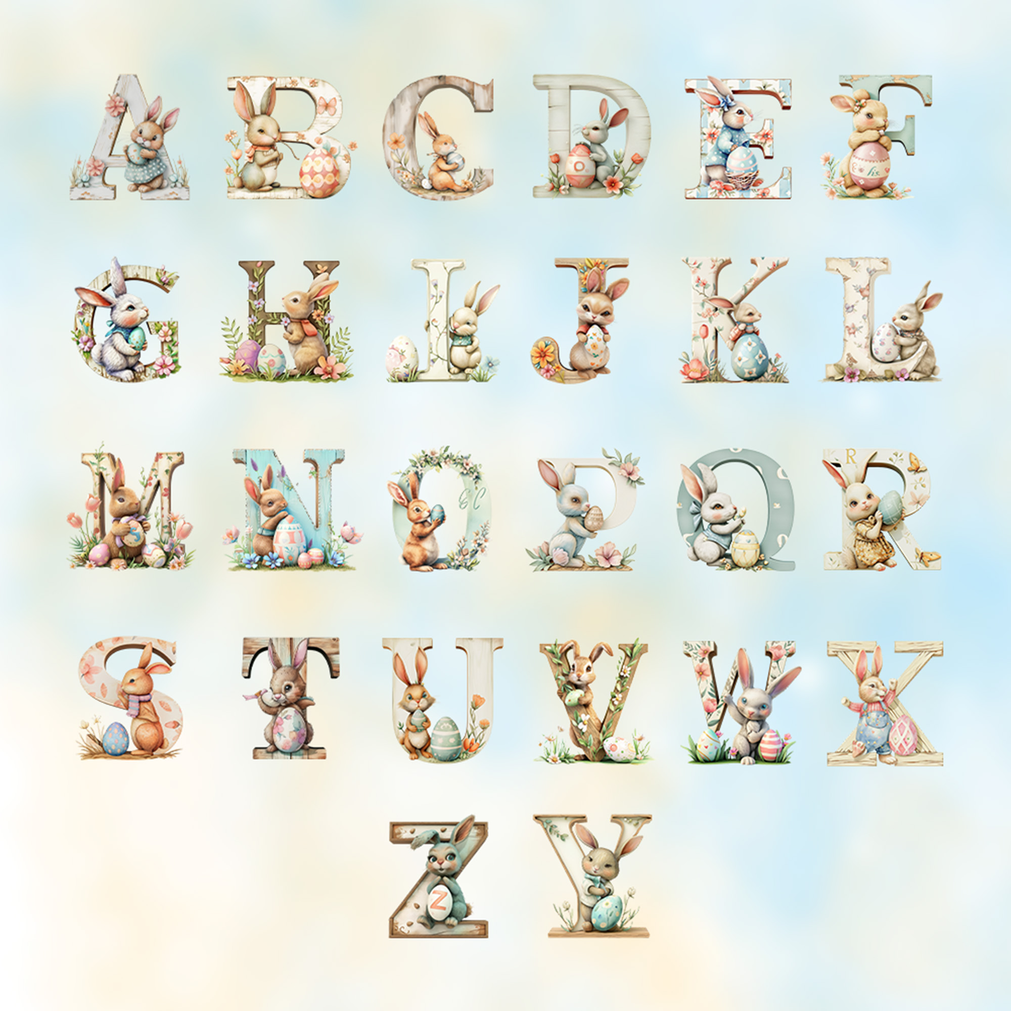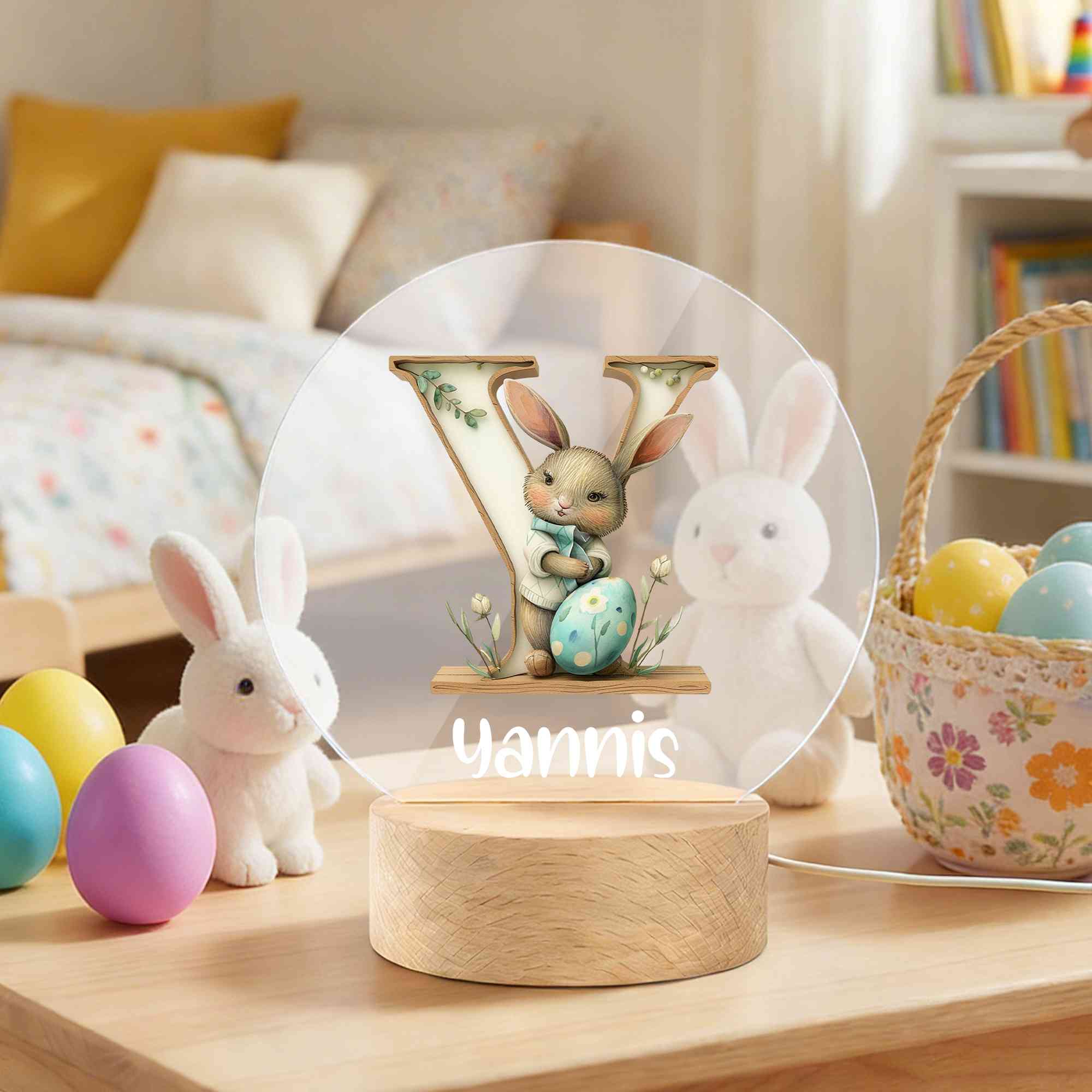 Watercolor Bunny Alphabet Design – This night light features a sweet watercolor-style illustration of a bunny nestled beside a large, decorative letter. The soft brushstrokes, floral accents, and pastel eggs create a delicate, storybook charm that brings gentle magic to any child’s room.