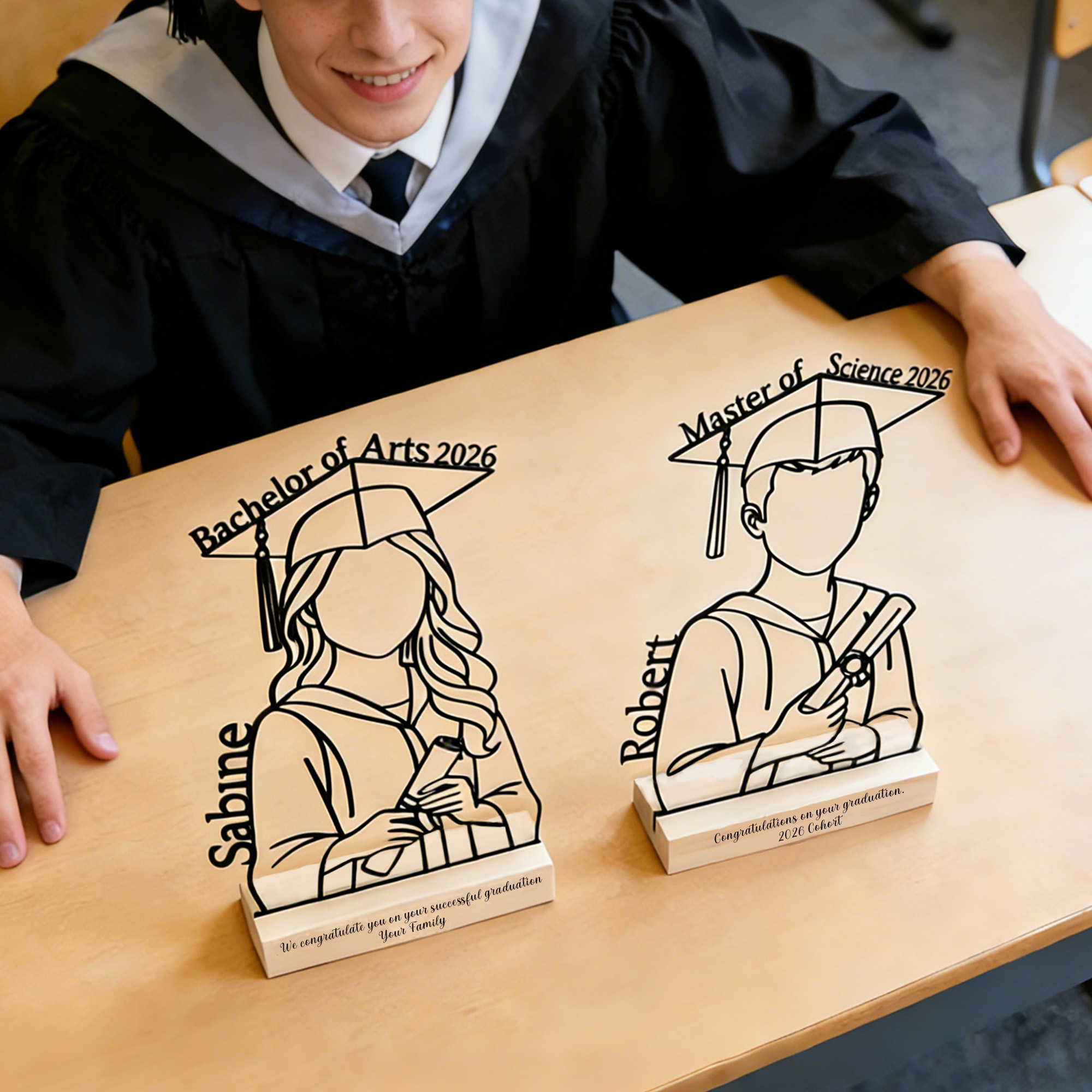 Personalized Details - Add the graduate’s name vertically along the silhouette for a sleek, modern touch—custom text is seamlessly integrated into the line art design, ensuring readability without disrupting the minimalist aesthetic; the wooden base can also be engraved with a short message for extra personalization.