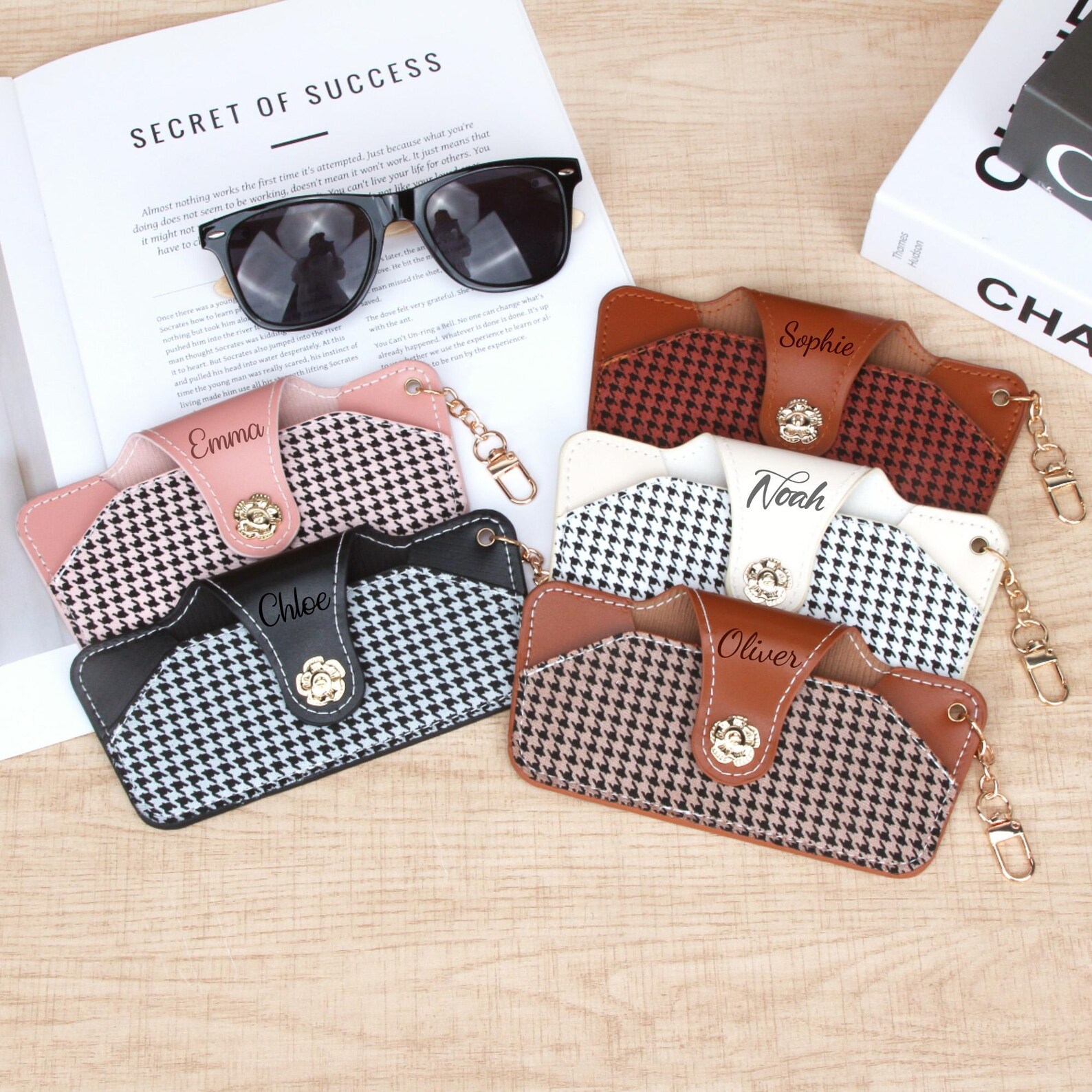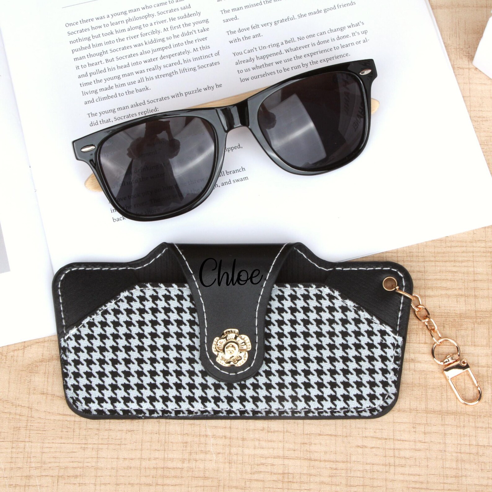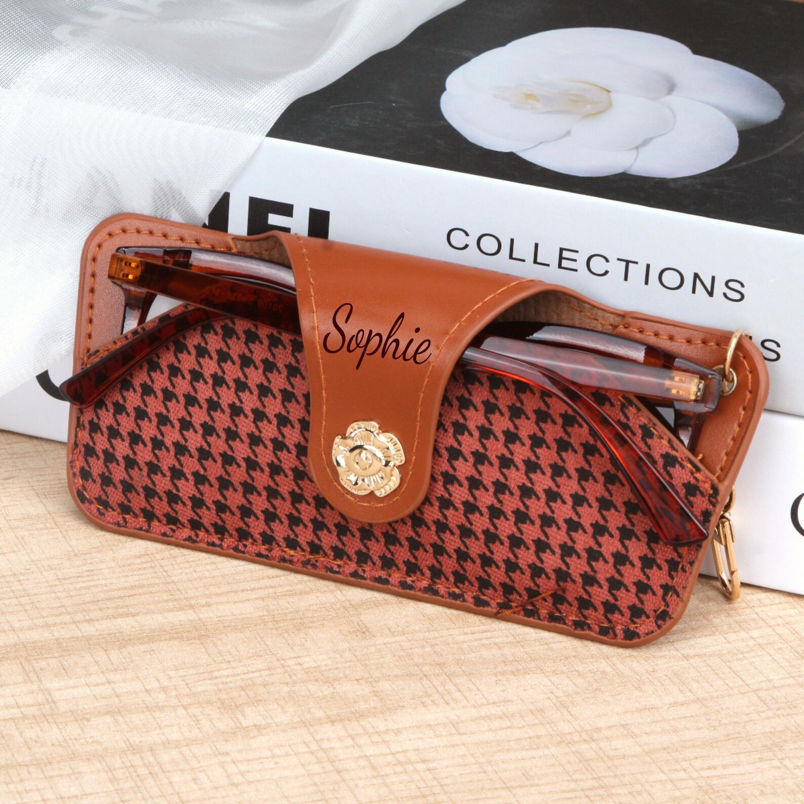 Personalized Name Plaid Camellia Glasses Case, Custom Leather Eyeglasses Holder with Snap Hook, Travel Essentials, Gift for Mom/Friends/Women