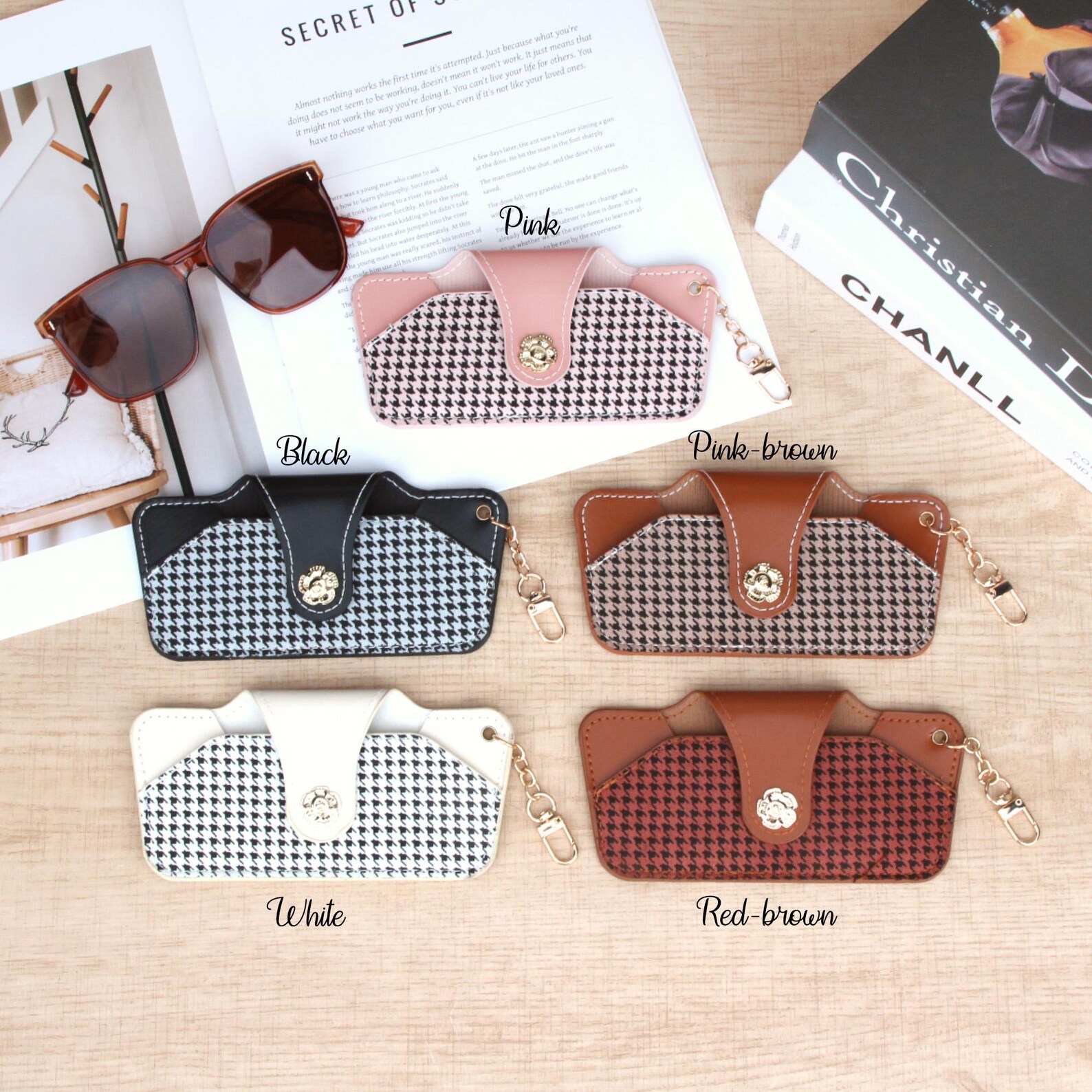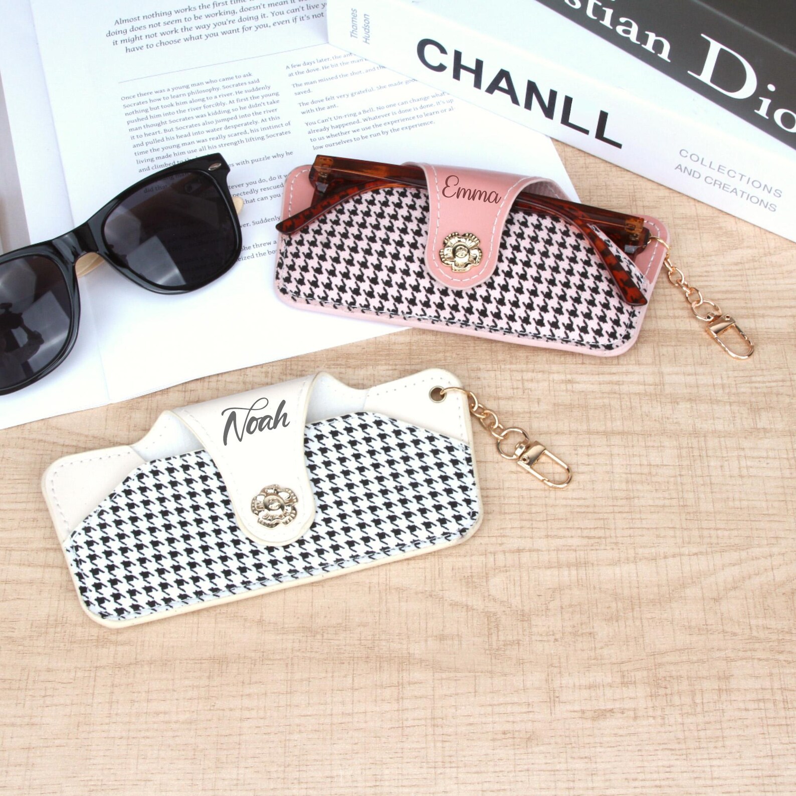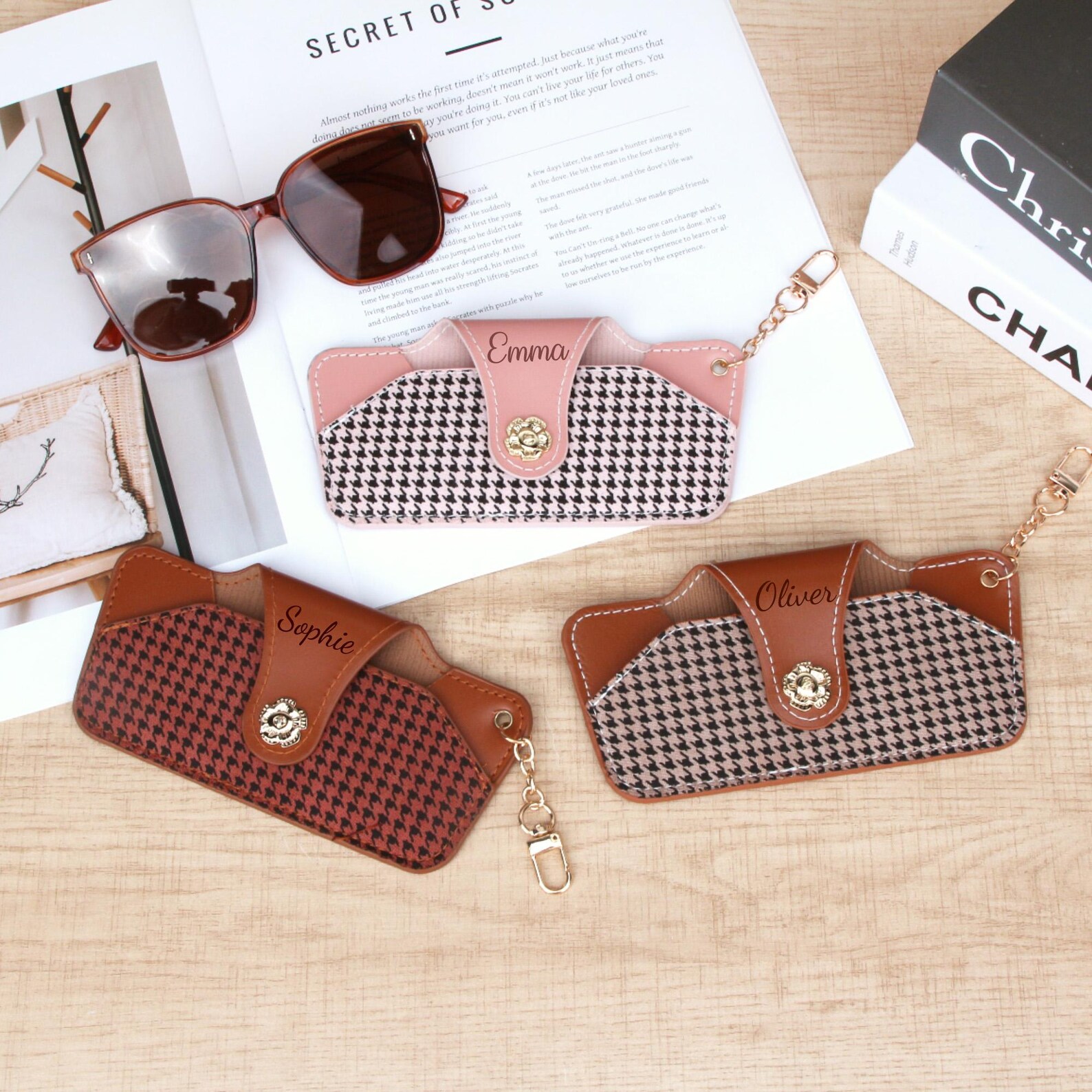 Personalized Name Plaid Camellia Glasses Case, Custom Leather Eyeglasses Holder with Snap Hook, Travel Essentials, Gift for Mom/Friends/Women