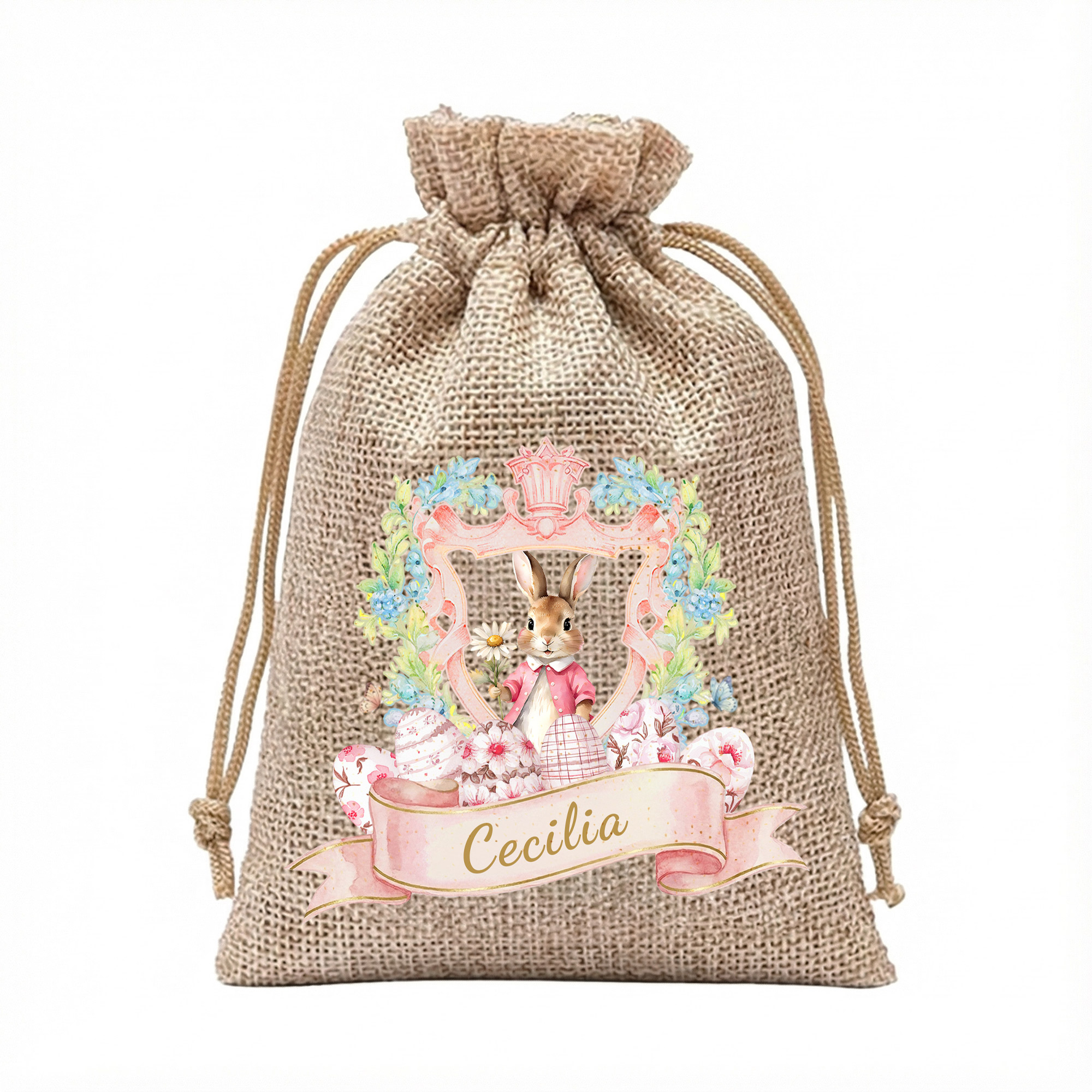 | Style | Personalized Name Watercolor Floral Frame Bunny Jute Bag with Drawstring |