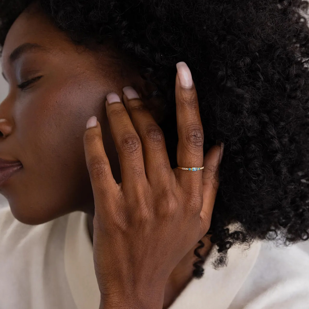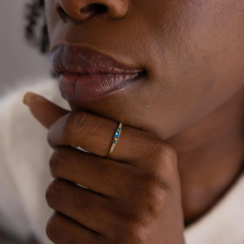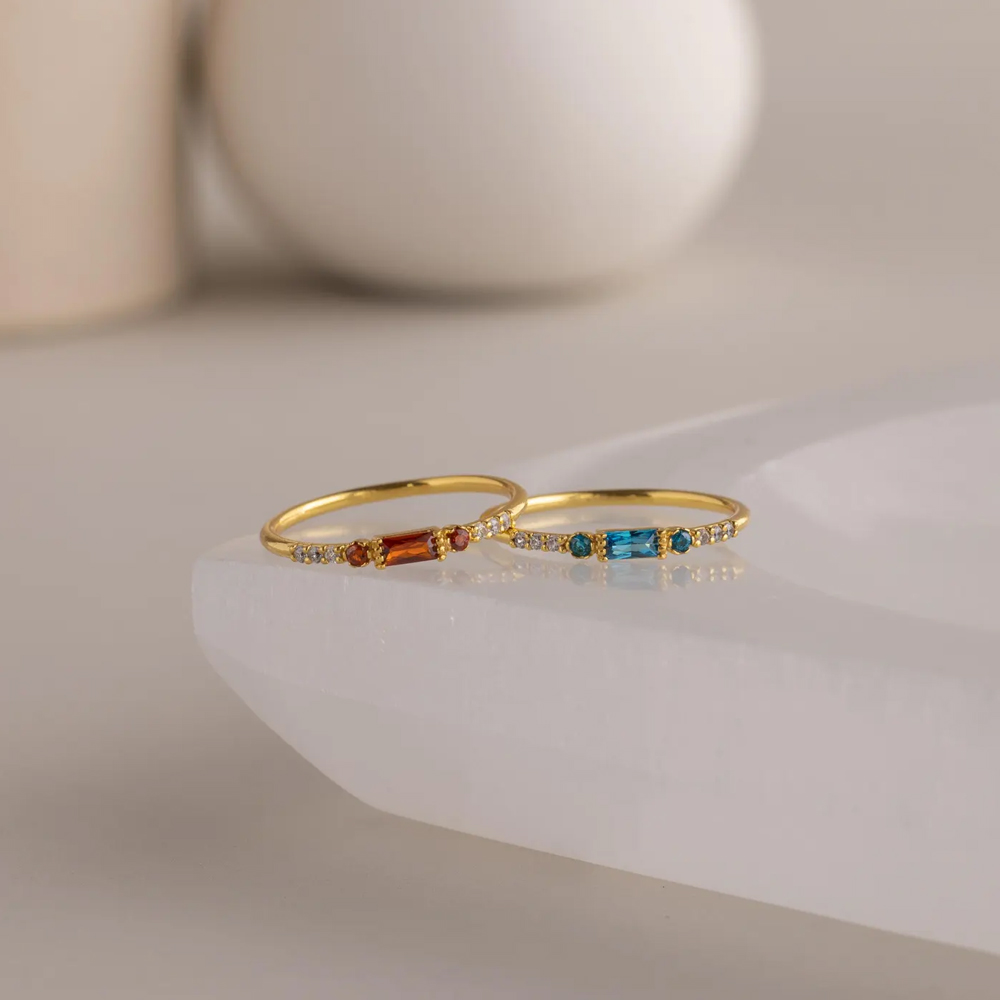 Elegant Baguette Design – This delicate ring features a sleek baguette-cut birthstone set in the center, flanked by sparkling pavé stones on either side. The minimalist yet refined design adds a touch of sophistication to any look, making it perfect for everyday wear or special occasions.